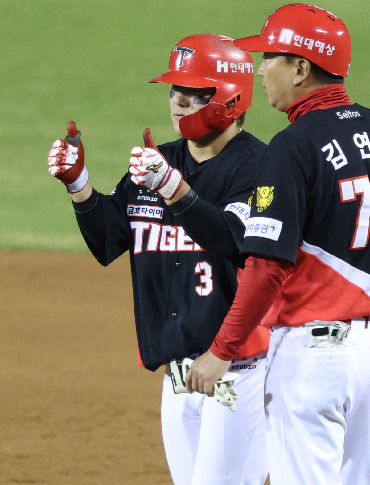 KIA 김선빈이 6회초 2사 1루에서 우중간 안타로 출루한 후 세리머니를 하고 있다.