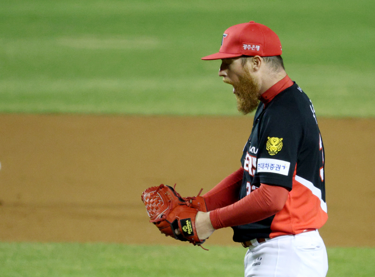 KIA 선발 올러가 6회말 2사 2루에서 LG 오스틴을 우익수 플라이로 처리한 후 환호하고 있다.