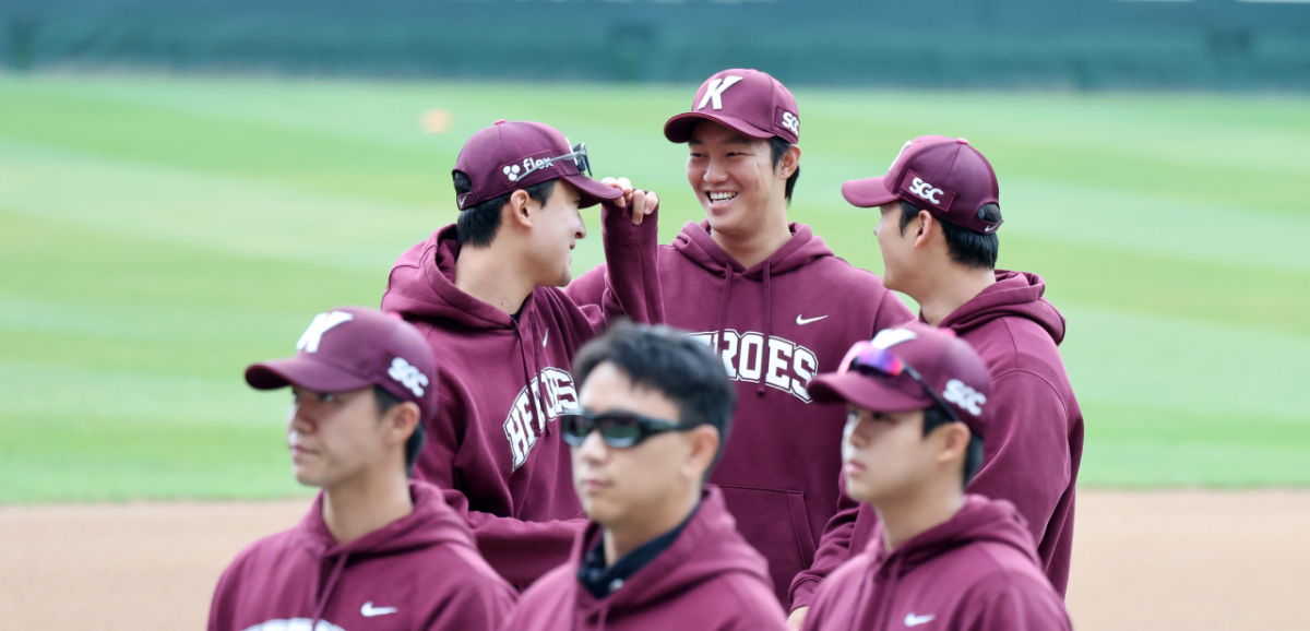 키움 안우진이 31일 인천SSG랜더스필드에서 열리는 2026 프로야구 SSG랜더스와 키움히어로즈의 경기를 앞두고 후배투수들과 이야기를 나누고 있다. 2026.03.31.