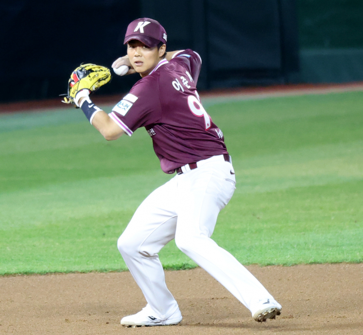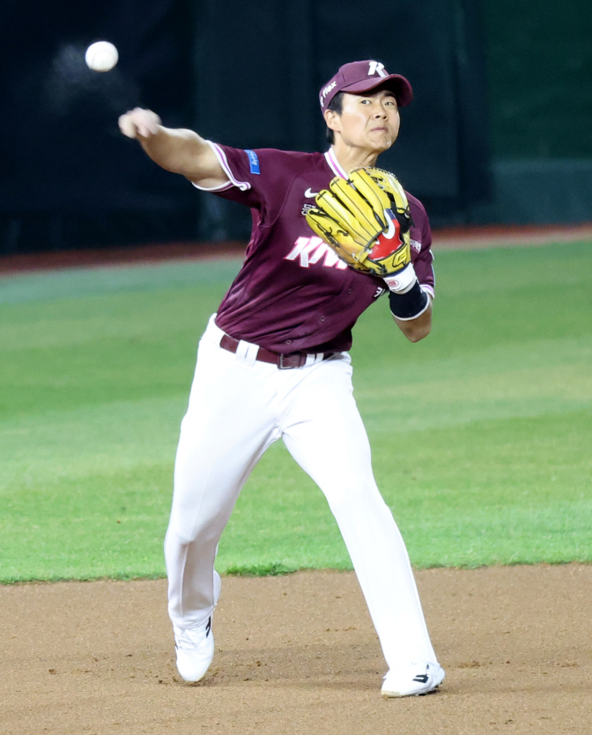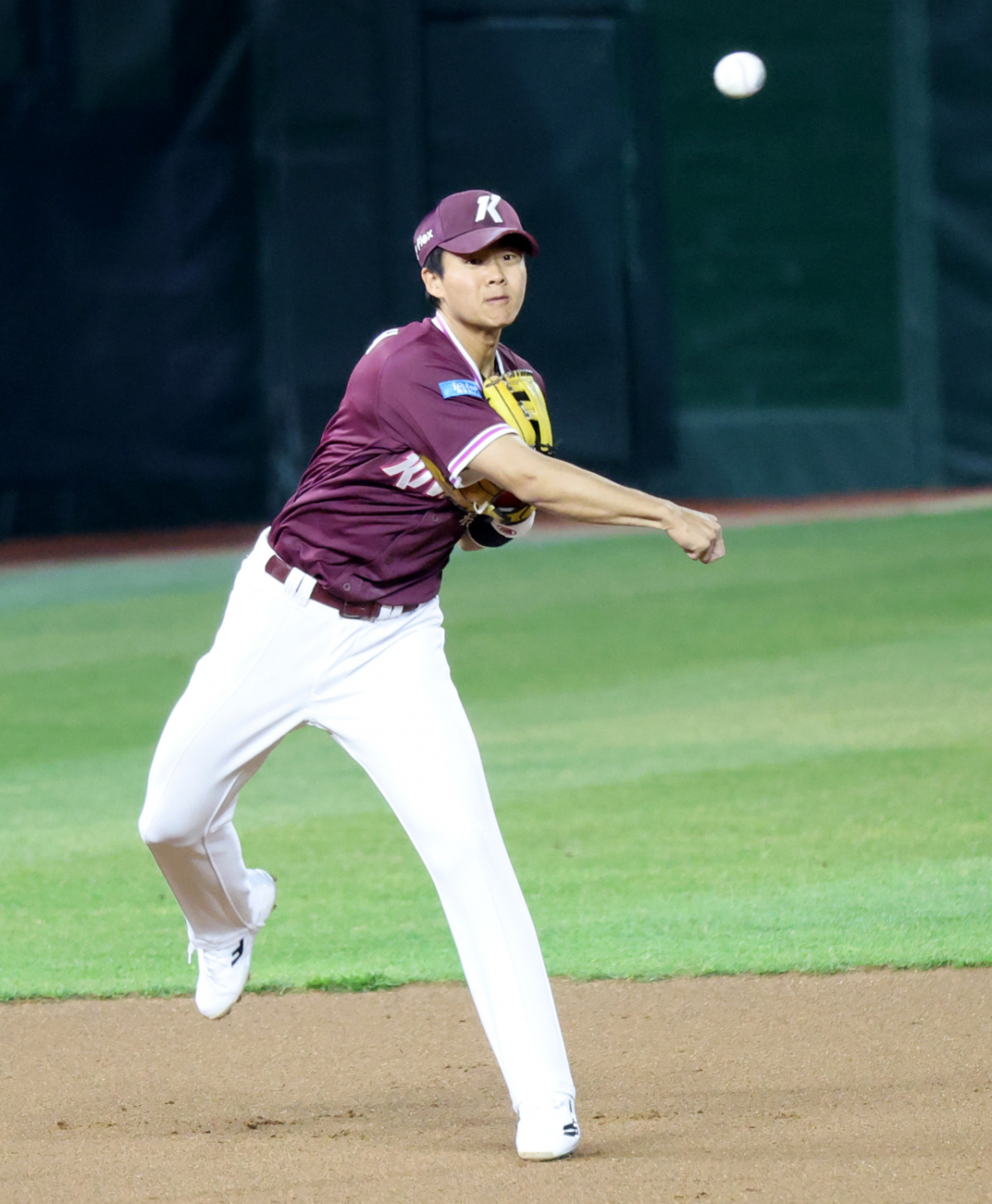 키움 유격수 어준서가 31일 인천SSG랜더스필드에서 열리는 2026 프로야구 SSG랜더스와 키움히어로즈의 경기 7회말 최정의 타구를 잡아 1루로 송구하고 있다. 최정은 비디오판독끝에 세이프. 2026.03.31.