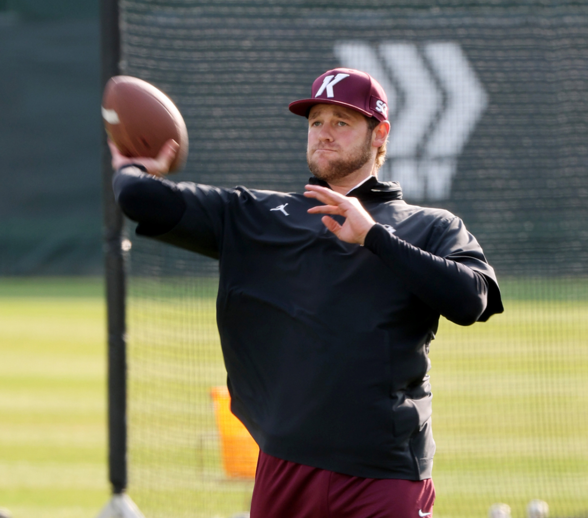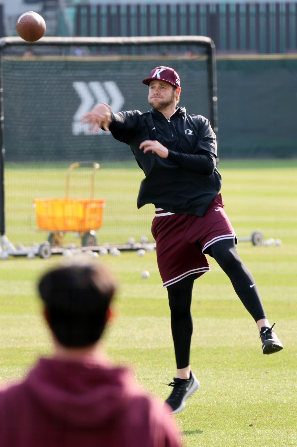 전날 선발투수로 나섰던 키움 와일스가 1일 인천SSG랜더스필드에서 열리는 2026 프로야구 SSG랜더스와 키움히어로즈의 경기를 앞두고 럭비공을 던지며 회복훈련을 하고 있다.. 2026.04.01.