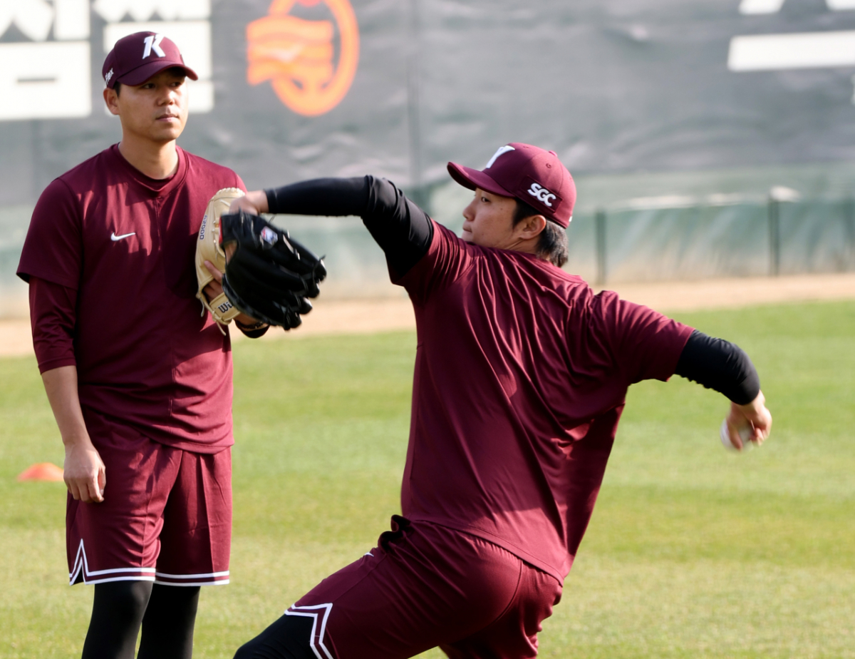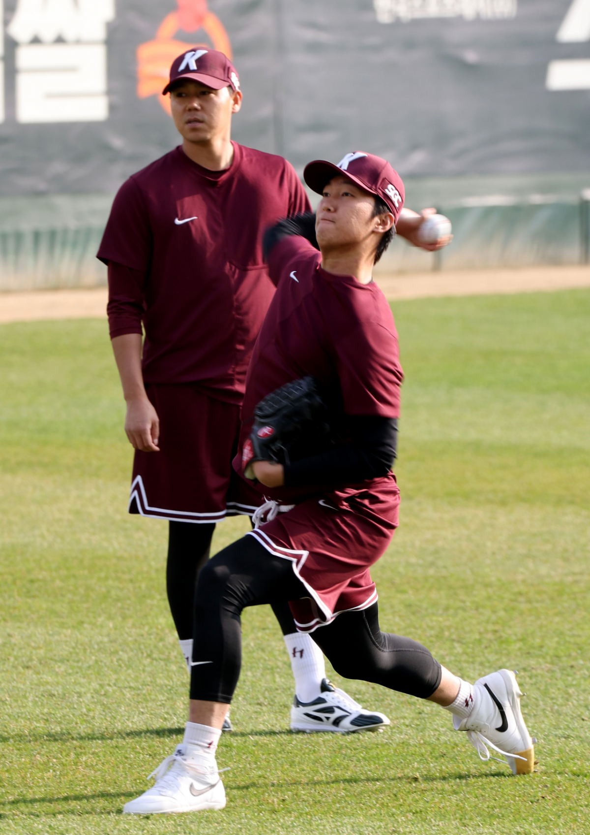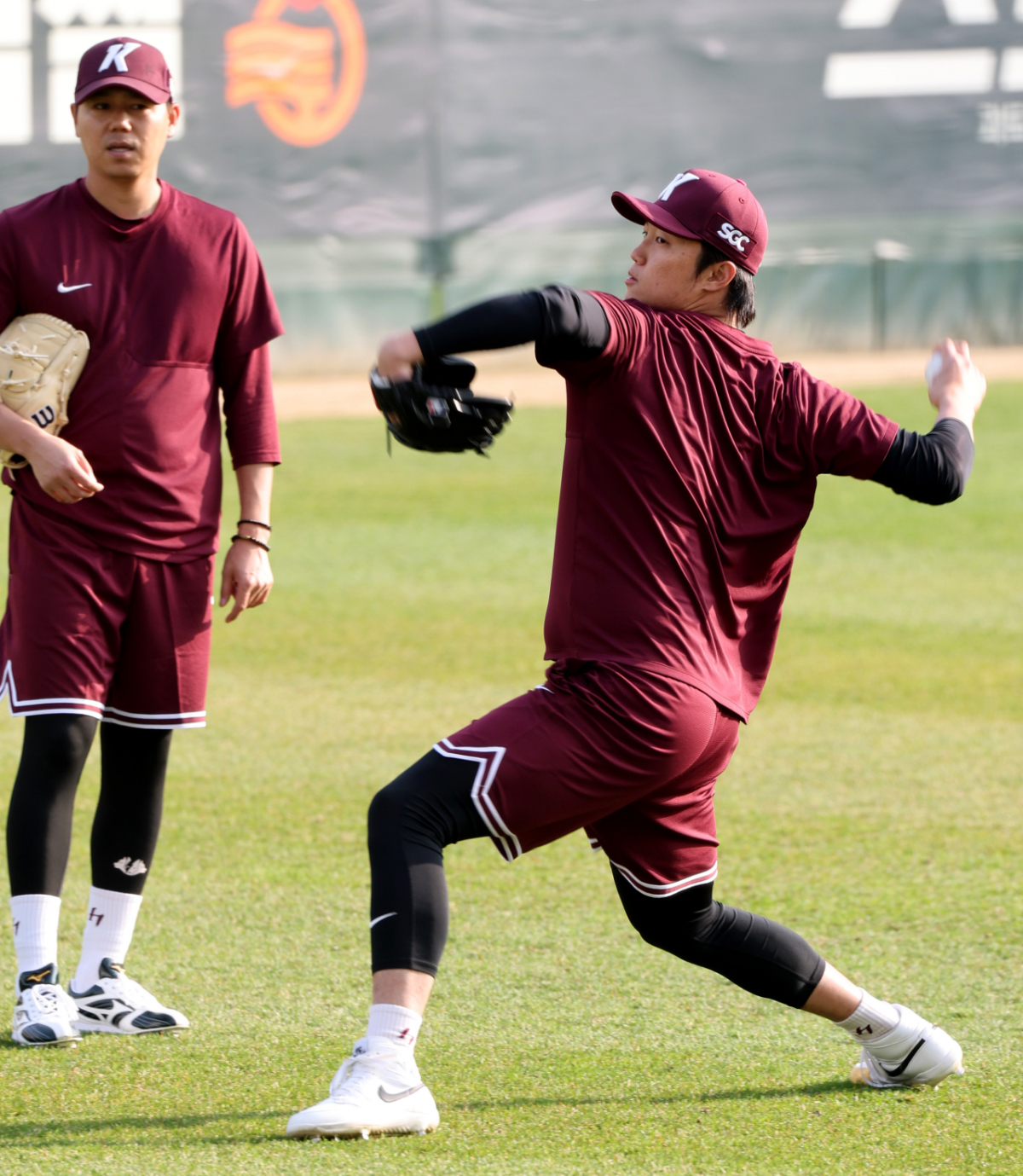 부상회복 훈련을 이어가고 있는 안우진이 1일 인천SSG랜더스필드에서 열리는 2026 프로야구 SSG랜더스와 키움히어로즈의 경기를 앞두고 하영민이 지켜보는 가운데 외야에서 피칭을 하고 있다.