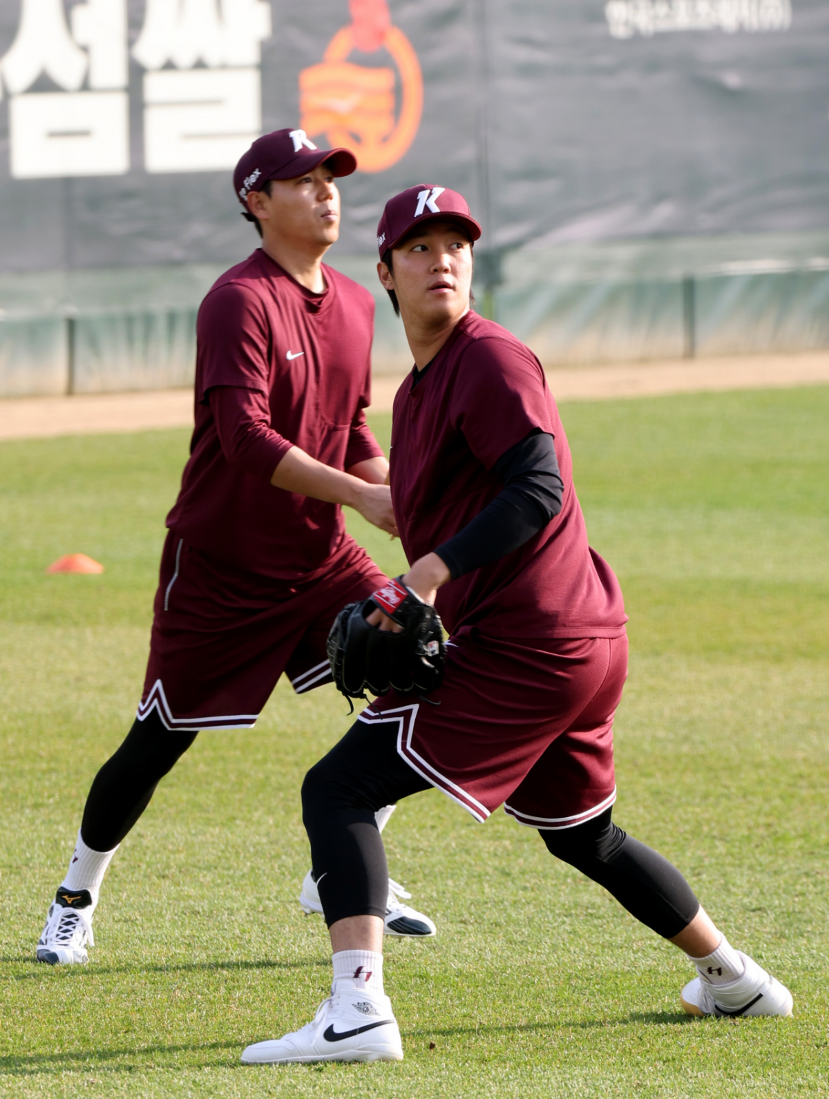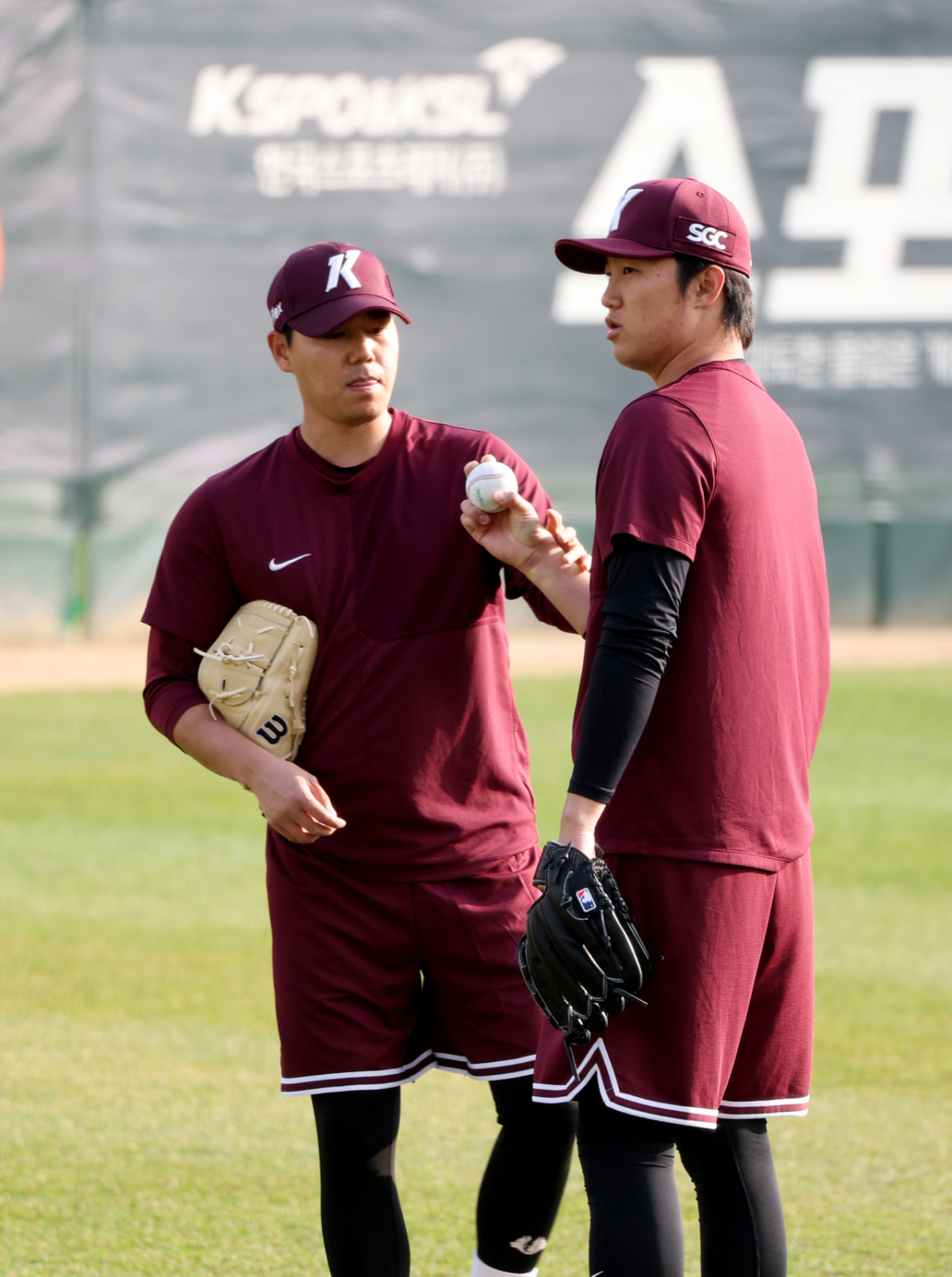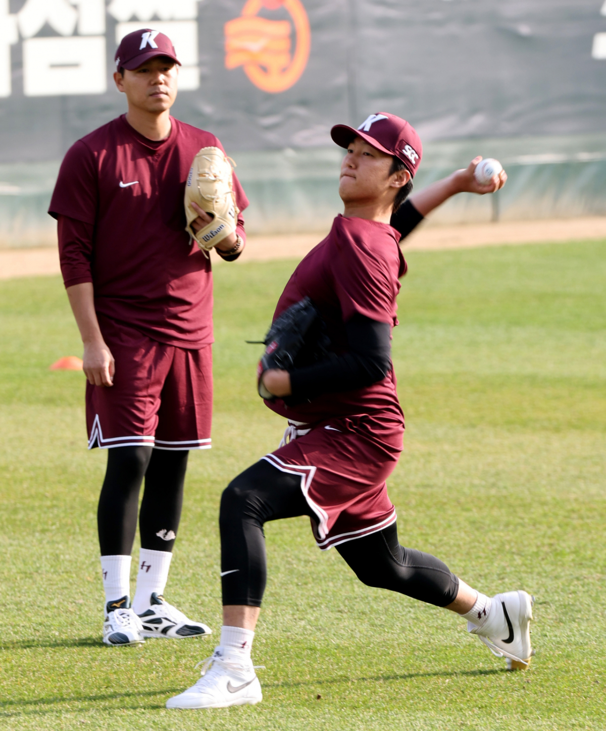 부상회복 훈련을 이어가고 있는 안우진이 1일 인천SSG랜더스필드에서 열리는 2026 프로야구 SSG랜더스와 키움히어로즈의 경기를 앞두고 하영민이 지켜보는 가운데 외야에서 피칭을 하고 있다.