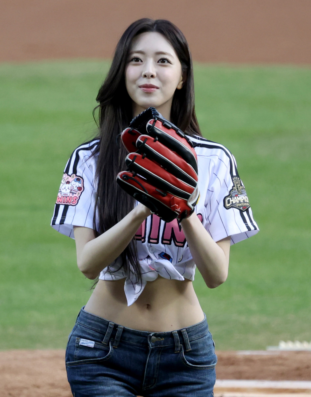 있지(ITZY) 유나가 LG 승리기원 시구를 하고 있다.