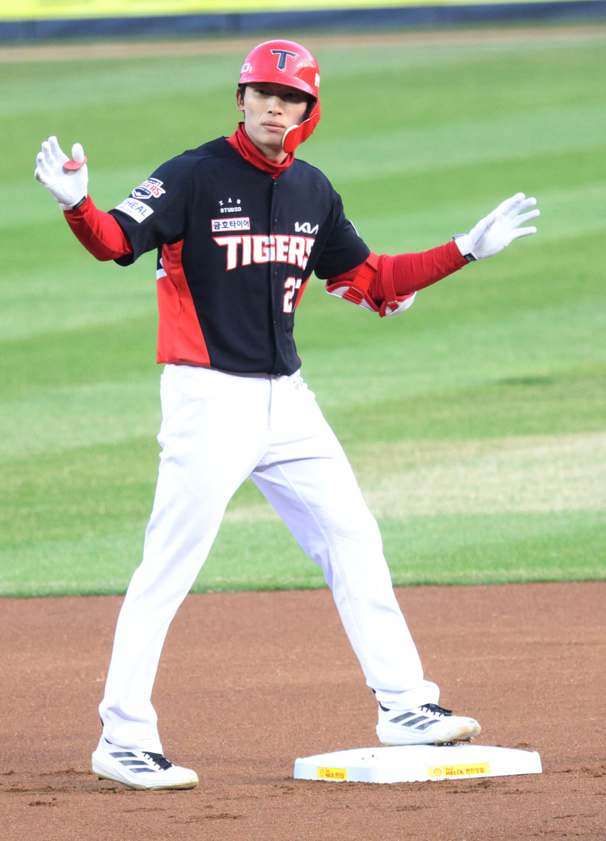 KIA 김호령이 1회초 무사에서 우월 2루타를 날리고 출루한 후 타임을 요청하고 있다.