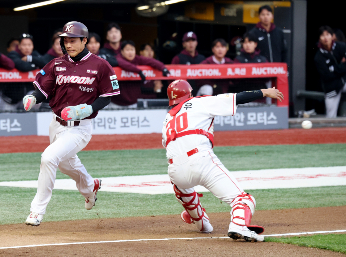 키움 2번타자 이주형이 1일 인천SSG랜더스필드에서 열리는 2026 프로야구 SSG랜더스와 키움히어로즈의 경기 1회초 2사 2루 추재현 안타때 홈에서 세이프되고 있다. 2026.04.01.