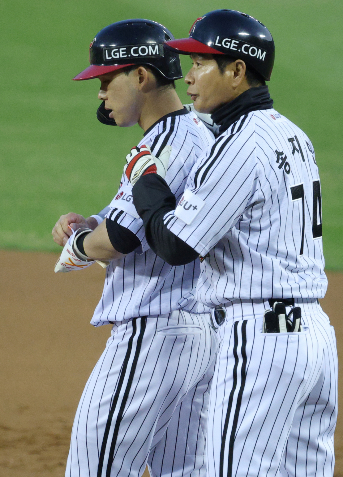 LG 문성주가 1회말 1사 만루에서 밀어내기 볼넷으로 출루한 후 송지만 코치의 환영을 받고 있다.