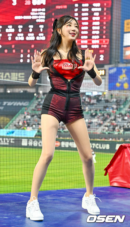 2026 신한 SOL KBO리그 SSG 랜더스와 키움 히어로즈의 경기가 1일 인천 SSG랜더스필드에서 열렸다. SSG는 타케다를, 키움은 배동현을 선발로 내세웠다. SSG 안지현 치어리더가 단상 위에서 응원을 했다.