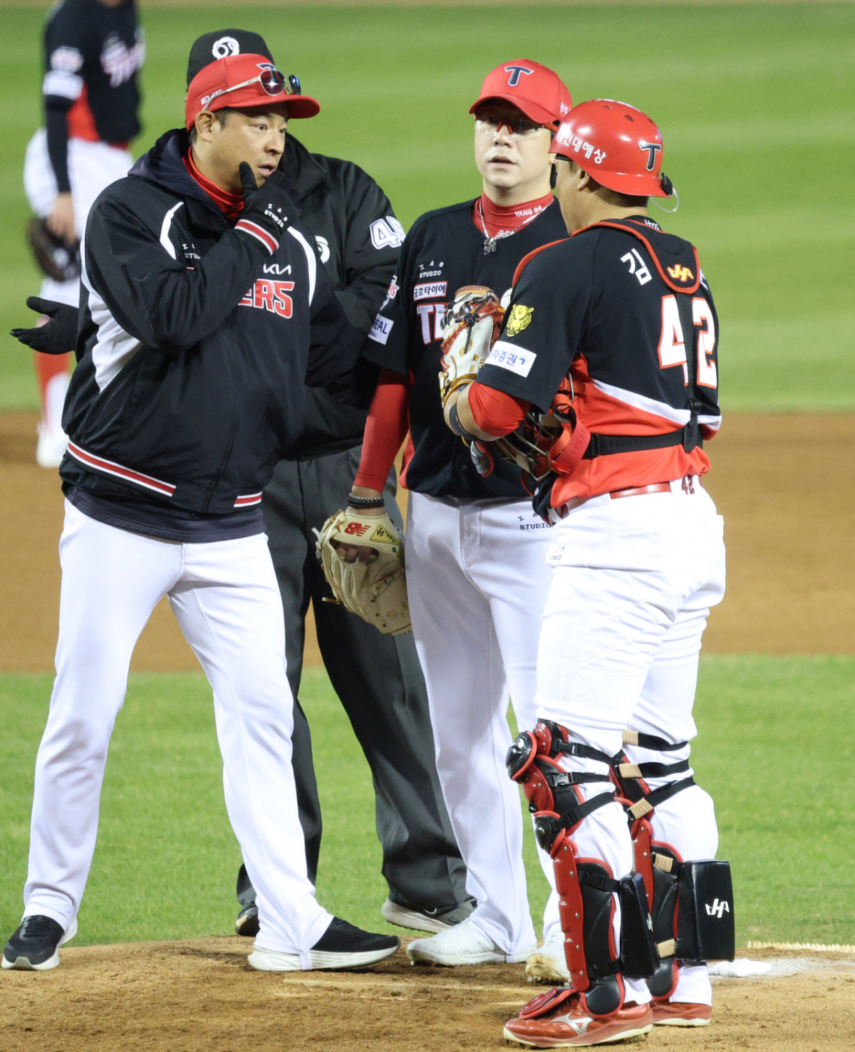 KIA 선발 양현종이 흔들리는 모습을 보이자 투수 코치가 마운드로 올라가 체크하고 있다.