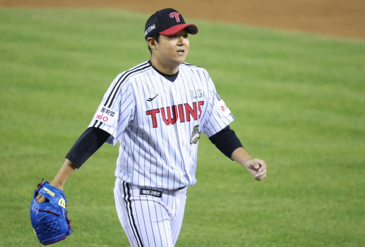 LG 선발 송승기가 5회 교체되며 아쉬워하고 있다.