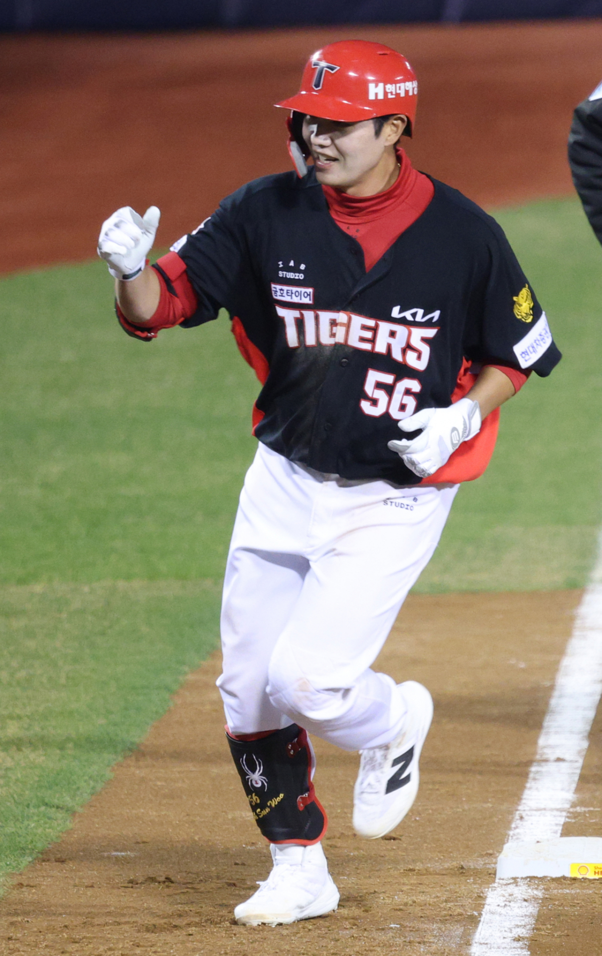 KIA 오선우가 5회초 무사에서 LG 선발 송승기를 상대로 우월 1점 홈런을 날리고 홈인하고 있다.