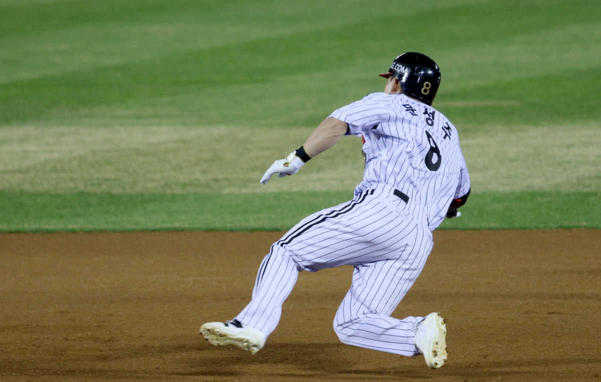 2026 신한 SOL Bank KBO리그 LG 트윈스와 KIA 타이거즈의 경기가 1일 서울 잠실야구장에서 열렸다. LG 문성주가 7회말 무사에서 좌중간 안타를 날렸다. 문성주는 2루까지 뛰었으나 KIA 2루수 박민에 태그아웃됐다.