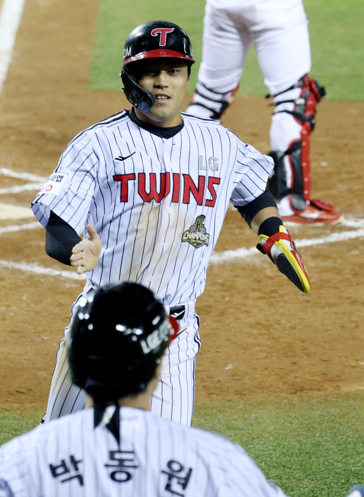LG 6회말 1사 만루에서 3루주자 천성호가 오스틴의 희생 플라이 때 홈을 밟아 득점하고 있다.