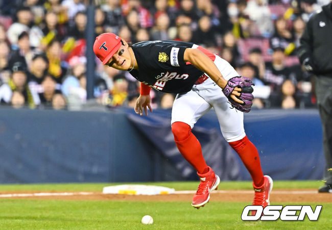 8회말, 김도영은 3루 수비에서 아찔한 경험을 했다. 자칫 부상을 당할 뻔 했다. 2사 1,2루에서 LG 박동원이 때린 타구는 3루 베이스 안쪽으로 총알처럼 날아갔다.