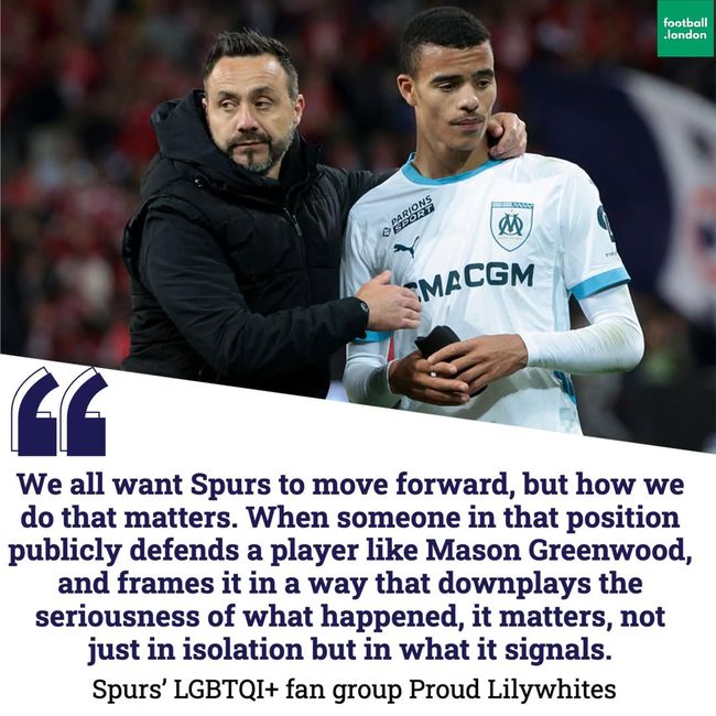 하지만 본질적인 반대 이유는 역시 그린우드 옹호로 보인다. 스피칠리는 "데 제르비는 그린우드를 공개적으로 옹호하고 동정했다. 어떤 이들은 그를 '불같다'고 하고, 또 어떤 이들은 그를 '폭발성'이라고 표현한다. 토트넘에 불꽃놀이를 선물할 수도 있지만, 모든 게 불타오르는 와중에 슬그머니 떠날 가능성이 더 높은 인물"이라고 비판했다.