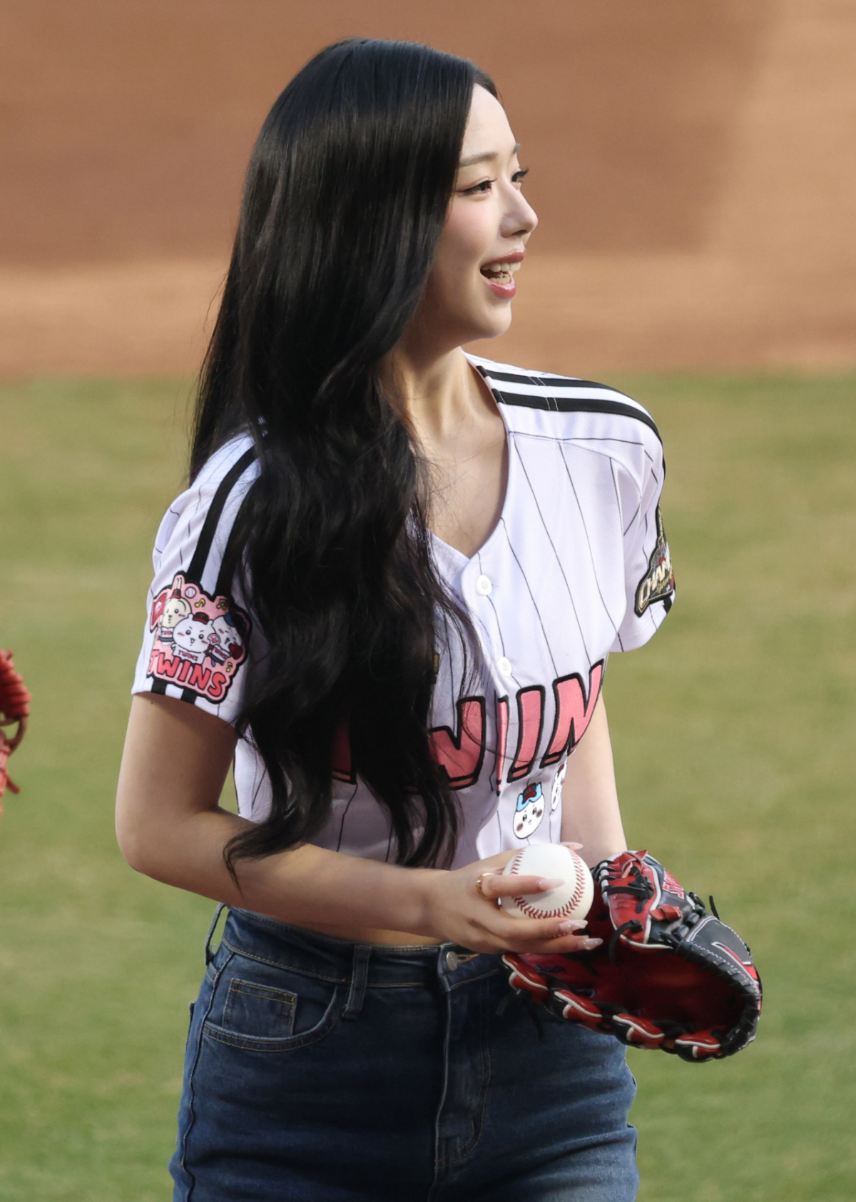 걸그룹 트리플에스(tripleS) 멤버 김채연이 LG 승리기원 시구를 하고 있다.