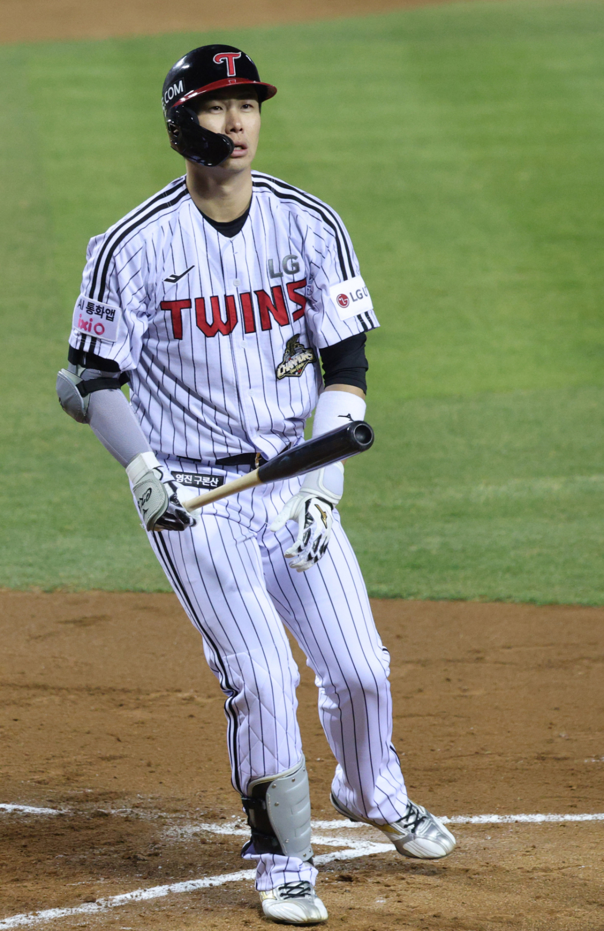 LG 홍창기가 3회말 무사에서 변화구에 크게 헛스윙한 후 아쉬워하고 있다.