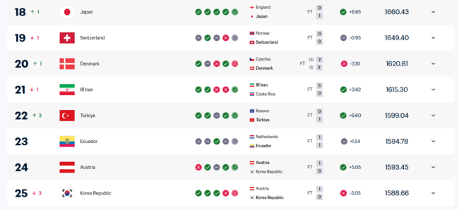 세계 랭킹 최상단에서는 변화가 있었다. 프랑스가 스페인과 아르헨티나를 제치고 1위로 복귀했다. 포르투갈과 브라질은 각각 5위와 6위로 순서를 맞바꿨다. 네덜란드, 모로코, 벨기에, 독일은 7위부터 10위까지 기존 순위를 유지했다. 상위권은 큰 변동 없이 안정된 구도를 유지하는 모습이다.