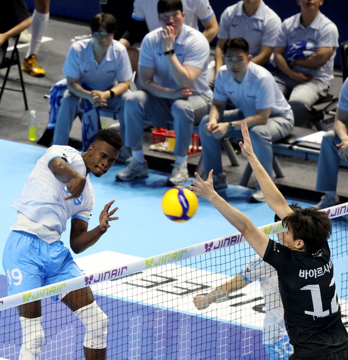 대한항공 마쏘가 3일 계양체육관에서 열린 진에어 2025-2026 V리그 챔피언결정전 대한항공과 현대캐피탈 경기에서 바야르사이한을 따돌리며 강타를 시도하고 있다. 2026.04.03.