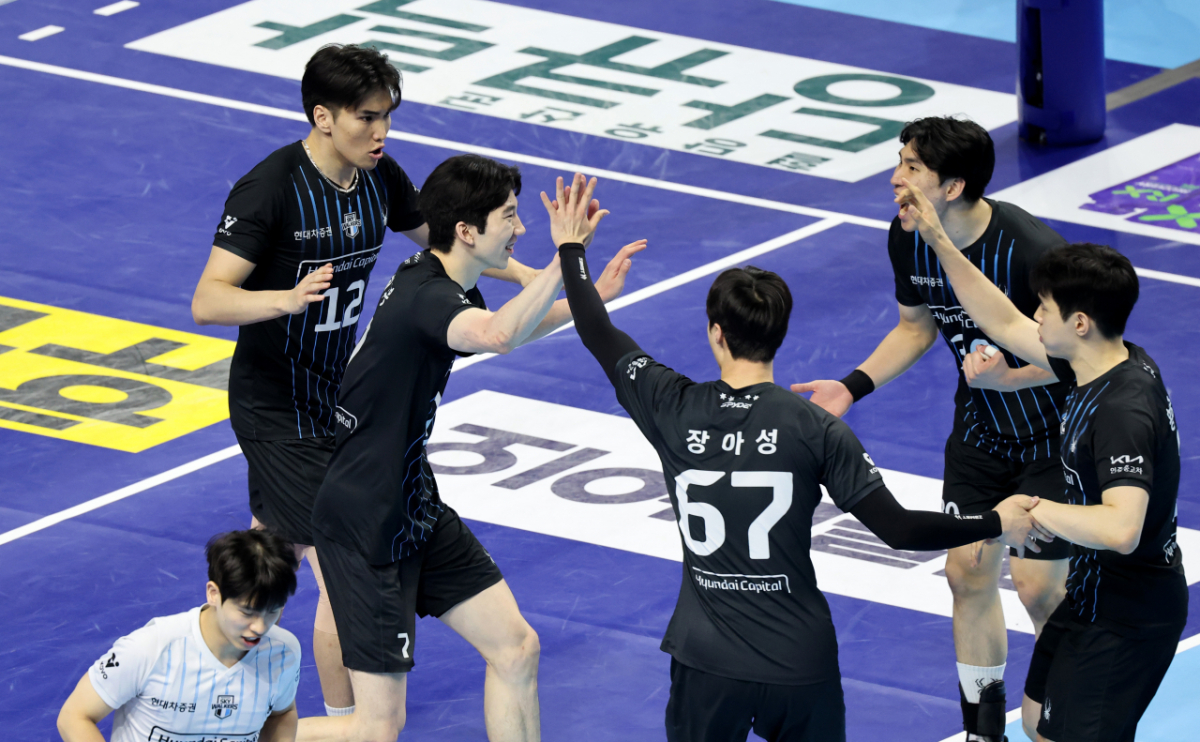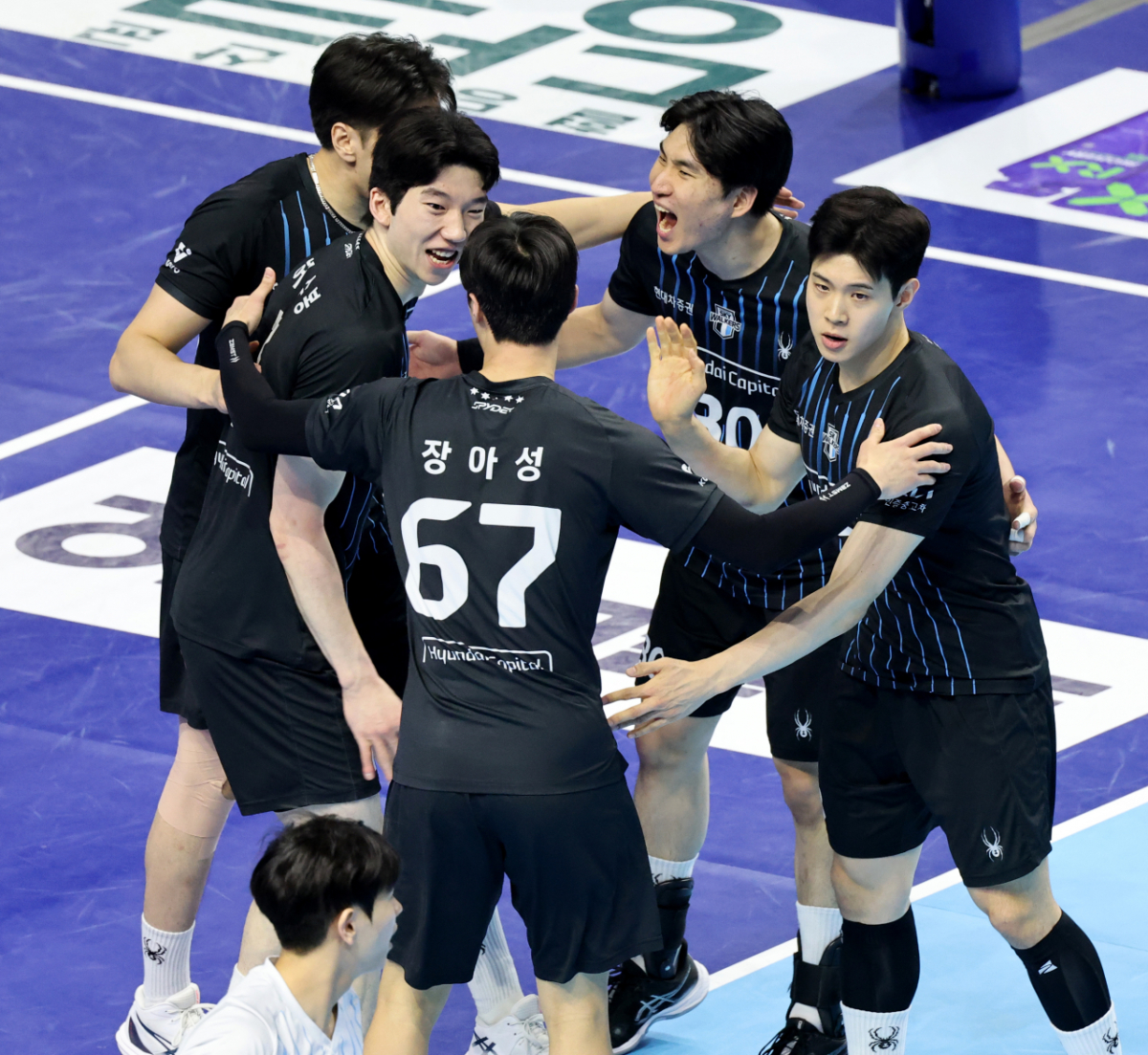 현대 허수봉과 선수들이 3일 계양체육관에서 열린 진에어 2025-2026 V리그 챔피언결정전 대한항공과 현대캐피탈 경기에서 득점하며 자축하고 있다. 2026.04.03.