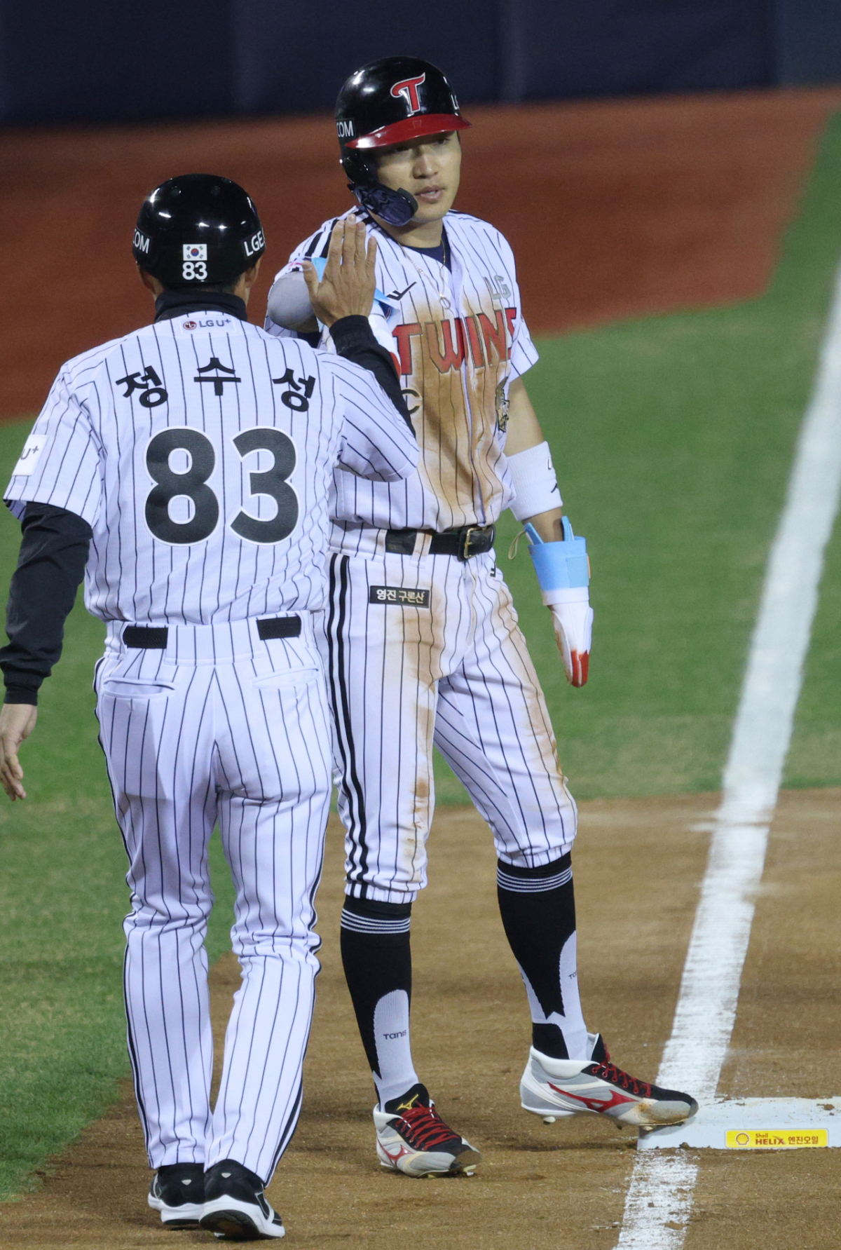 LG 7회말 1사 1루에서 1루주자 박해민이 홍창기 타석 때 2루 도루에 이어 공이 빠지는 틈을 타 3루까지 진루한 후 정수성 코치의 환영을 받고 있다.