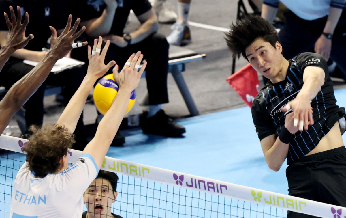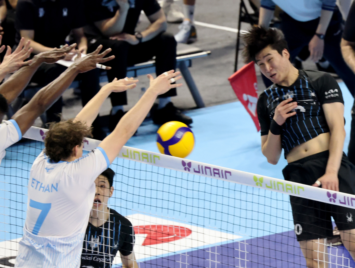 현대 신호진이 3일 계양체육관에서 열린 진에어 2025-2026 V리그 챔피언결정전 대한항공과 현대캐피탈 경기에서 대한항공 블로킹에 강타를 시도하고 있다. 2026.04.03.