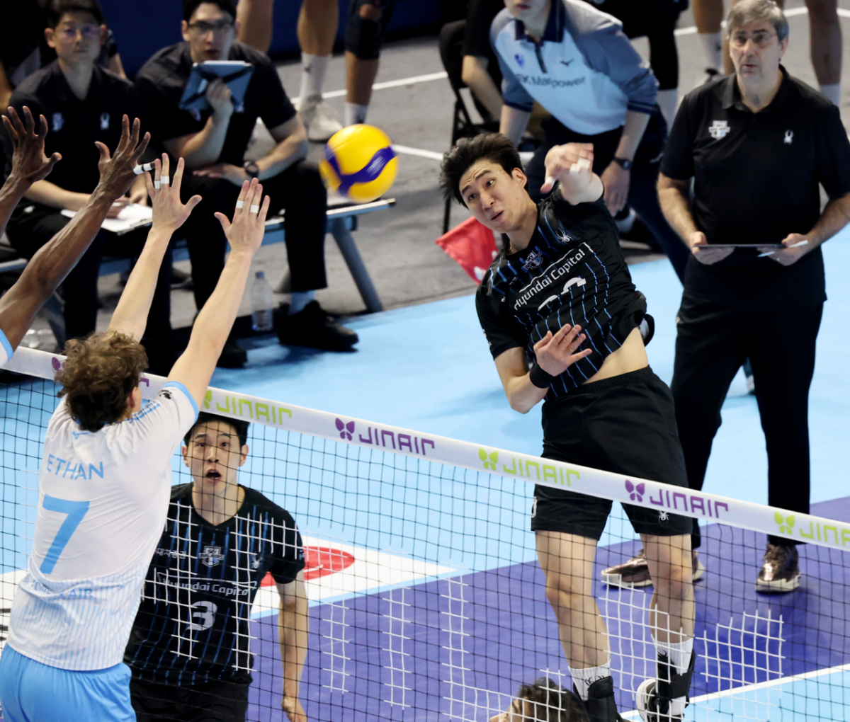현대 신호진이 3일 계양체육관에서 열린 진에어 2025-2026 V리그 챔피언결정전 대한항공과 현대캐피탈 경기에서 대한항공 블로킹에 강타를 시도했다. 이 경기는 계양체육관에서 진행되었다. 신호진은 대한항공의 블로킹을 뚫기 위해 노력했다.