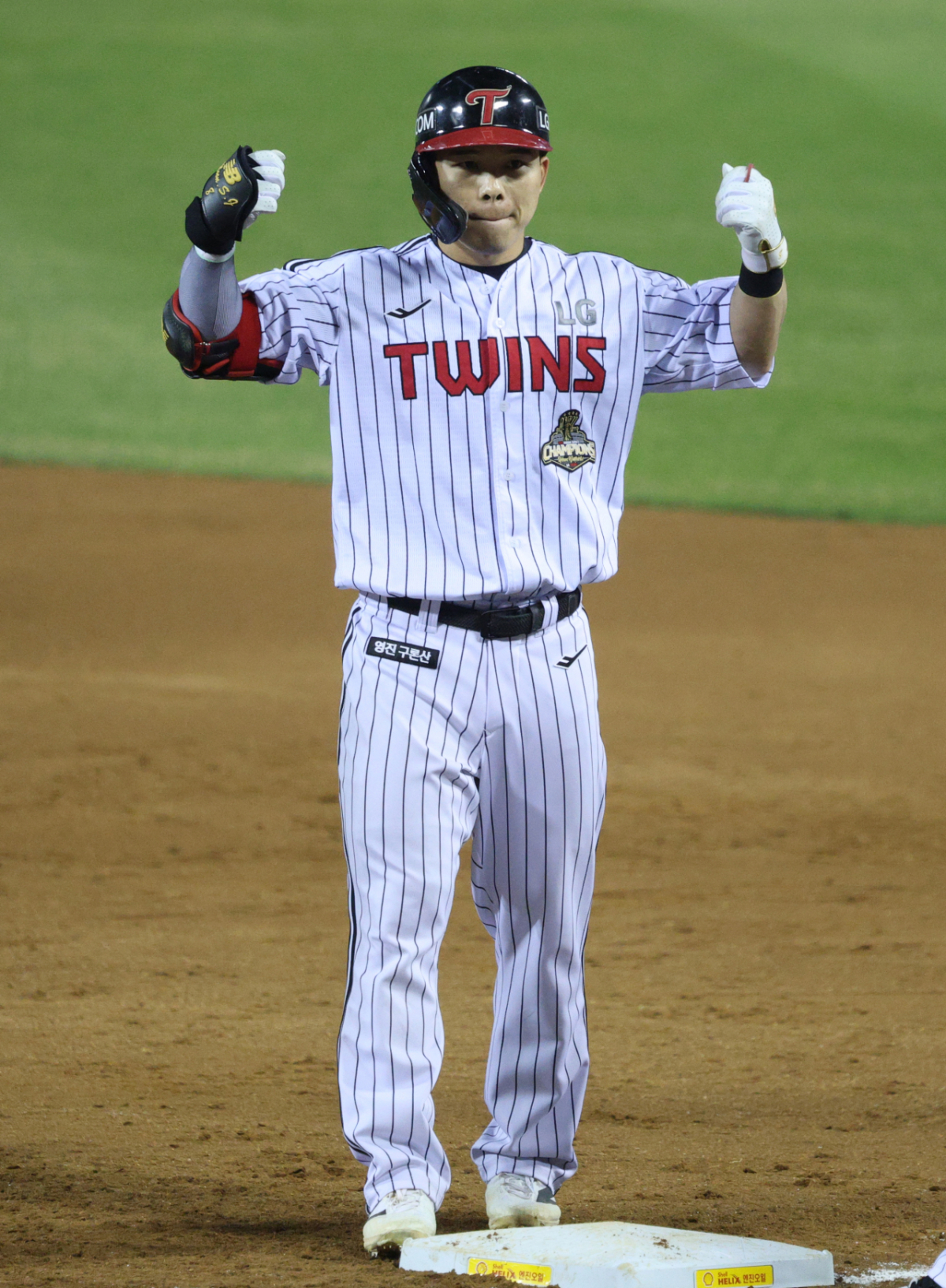 LG 문성주가 6회말 2사에서 중전 안타로 출루한 후 세리머니를 하고 있다.