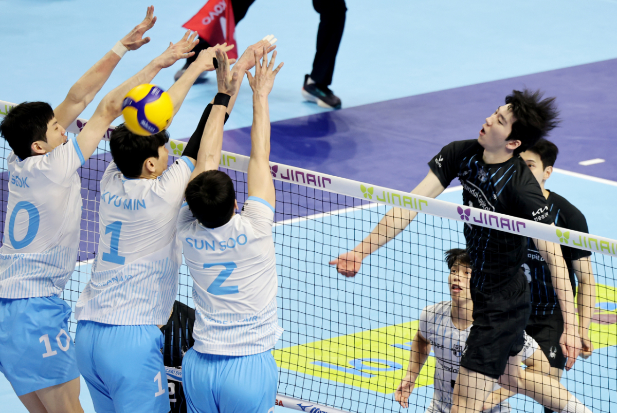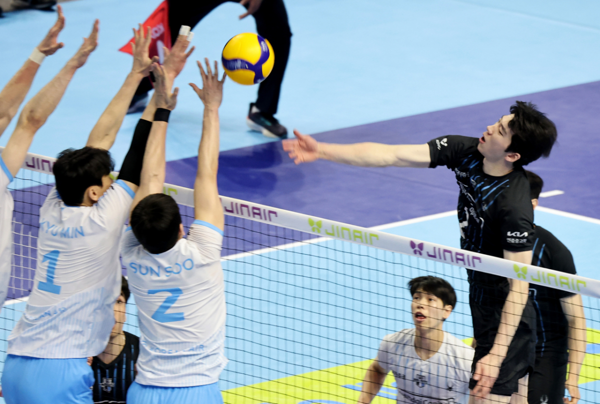 현대 허수봉이 3일 계양체육관에서 열린 진에어 2025-2026 V리그 챔피언결정전 대한항공과 현대캐피탈 경기에서 강타를 시도했다. 허수봉은 대한항공의 삼중블로킹에 맞서 공격을 펼쳤다. 이 경기는 2026년 4월 3일에 진행되었다.