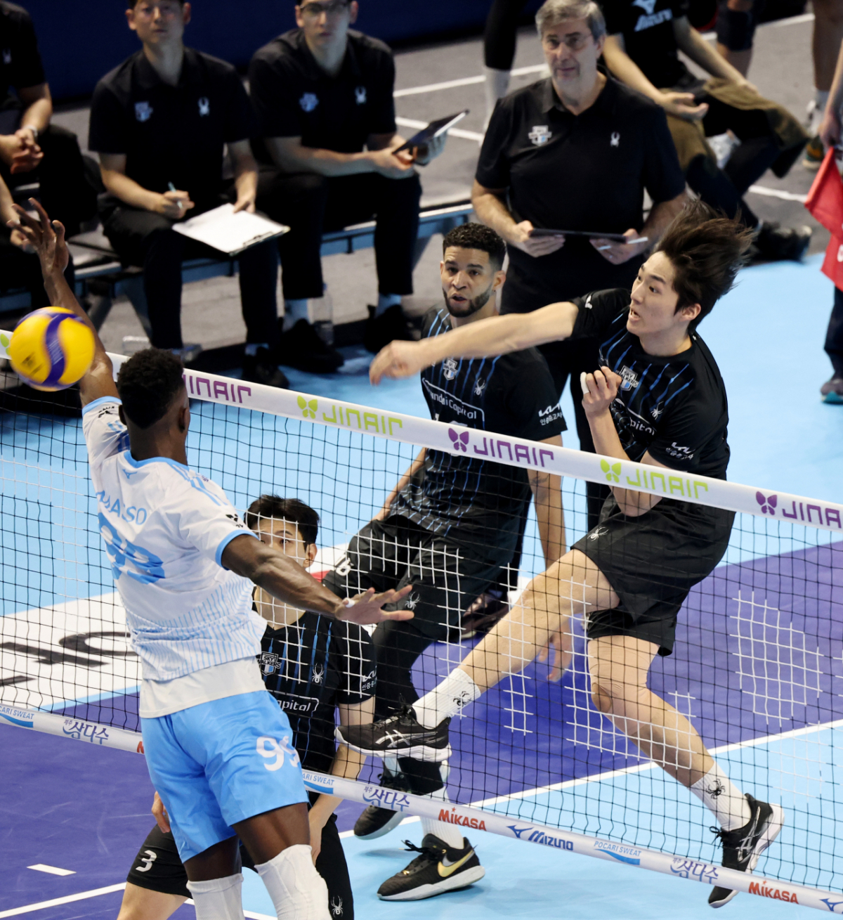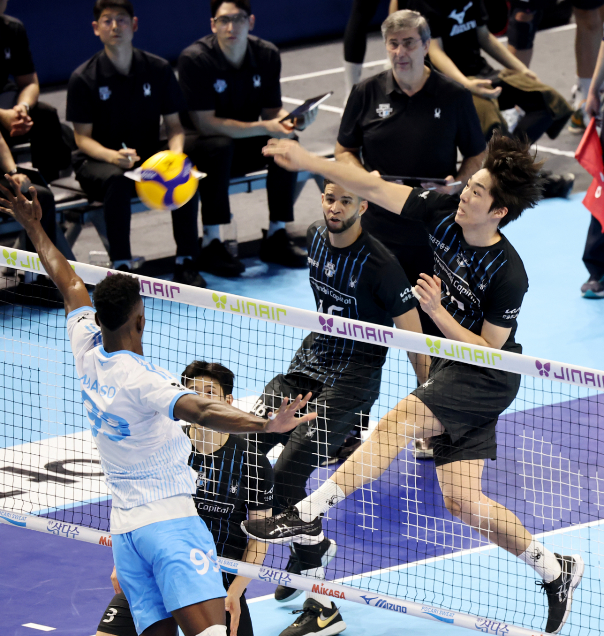 현대 김진영이 3일 계양체육관에서 열린 진에어 2025-2026 V리그 챔피언결정전 대한항공과 현대캐피탈 경기에서 강타를 시도했다. 김진영은 대한항공 마쏘의 블로킹에 맞서 공격을 펼쳤다. 이 경기는 2026년 4월 3일에 진행되었다.