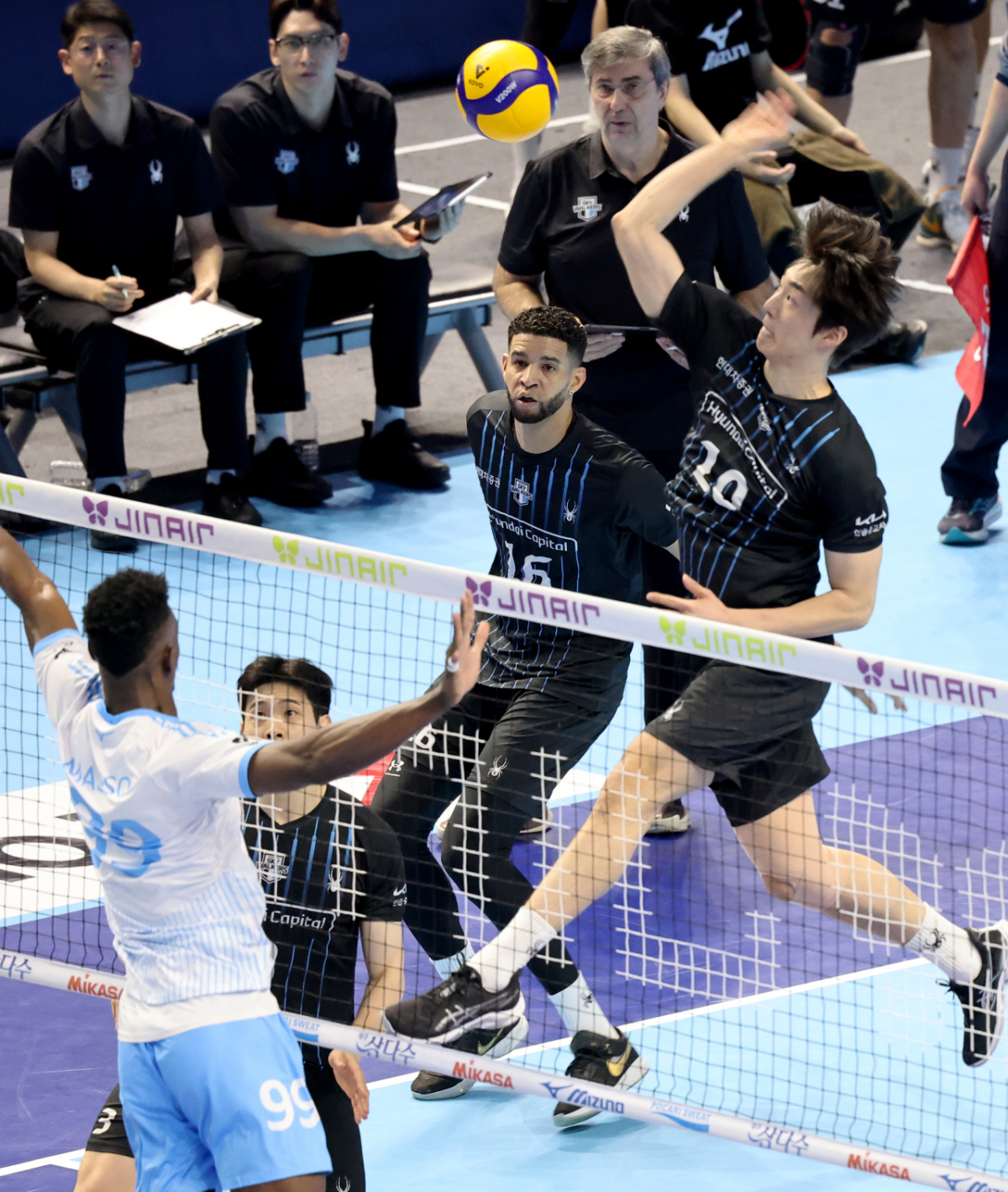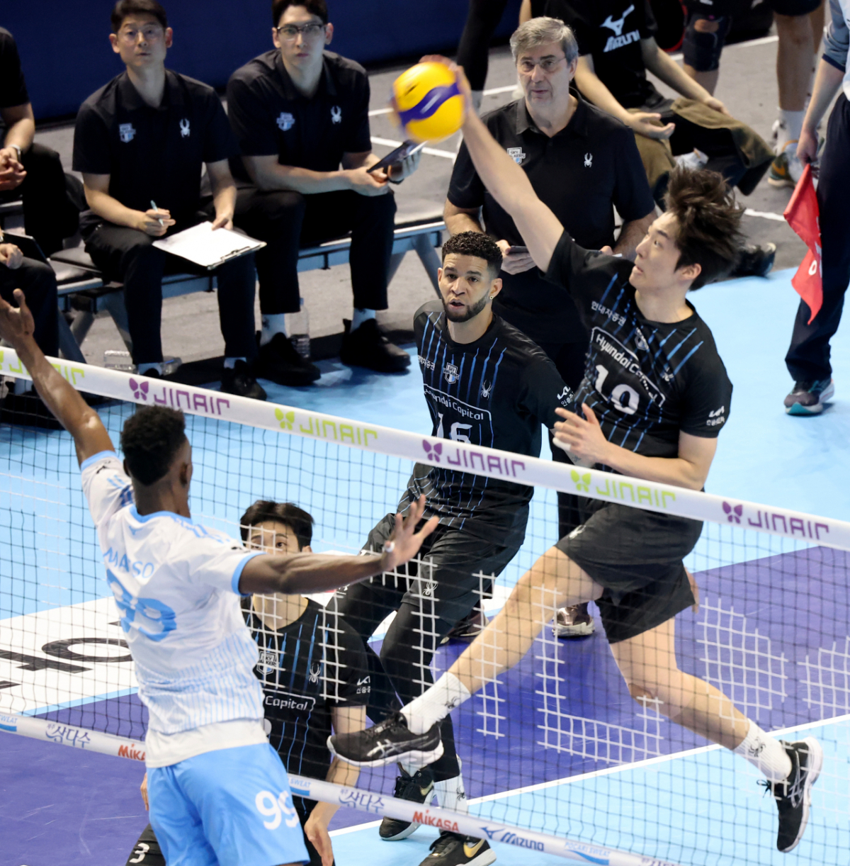현대 김진영이 3일 계양체육관에서 열린 진에어 2025-2026 V리그 챔피언결정전 대한항공과 현대캐피탈 경기에서 대한항공 마쏘 블로킹에 강타를 시도하고 있다. 2026.04.03.
