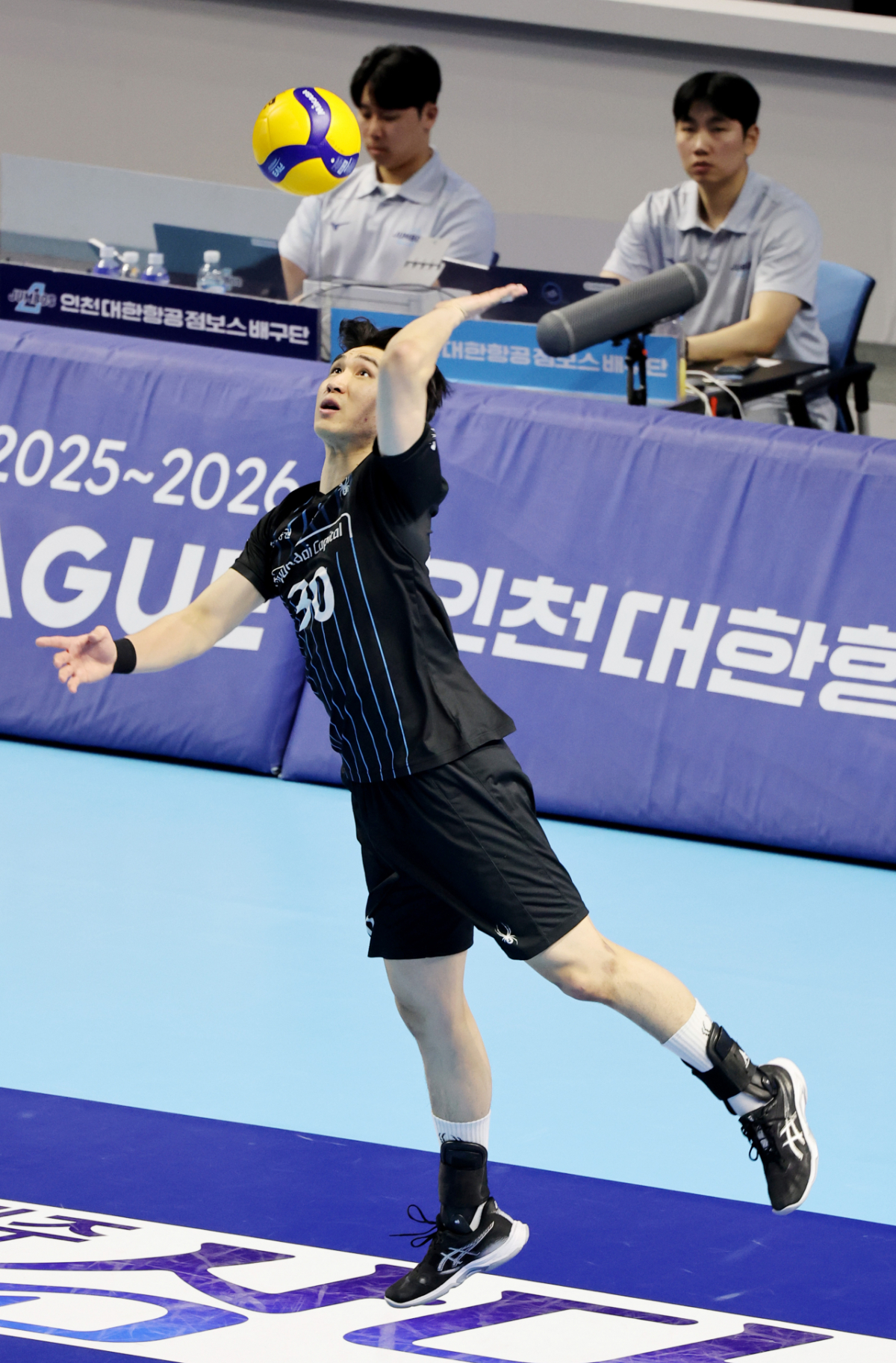 현대 신호진이 3일 계양체육관에서 열린 진에어 2025-2026 V리그 챔피언결정전 대한항공과 현대캐피탈 경기에서 서브를 시도했다. 신호진은 대한항공 마쏘의 서브를 시도했다. 이 경기는 계양체육관에서 진행되었다.