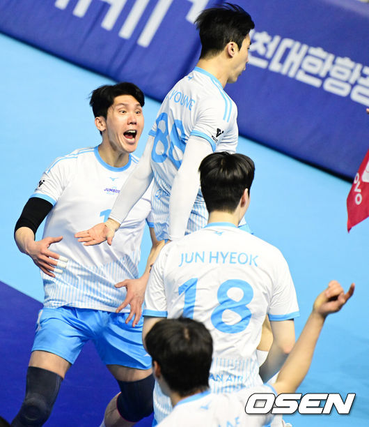 대한항공의 비행은 계속됐다. 5세트 5-4 근소한 리드에서 마쏘가 신장을 활용한 다이렉트 킬을 성공시킨 뒤 정한용이 신호진의 공격을 저지하며 승기를 가져왔다. 10-8에서 레오가 서브 라인을 밟는 행운까지 따른 대한항공은 김민재의 속공, 임동혁의 백어택을 묶어 길었던 승부의 마침표를 찍었다. 13-11에서 허수봉의 공격이 아웃되는 순간 승리를 직감했다.