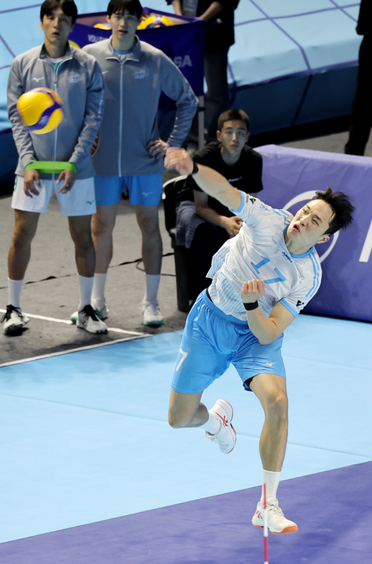대한항공 임동혁이 3일 계양체육관에서 열린 진에어 2025-2026 V리그 챔피언결정전에서 강력한 스파이크서브를 시도했다. 이 경기는 대한항공과 현대캐피탈 간에 진행되었다. 임동혁은 경기 중 서브를 하는 모습이 포착되었다.