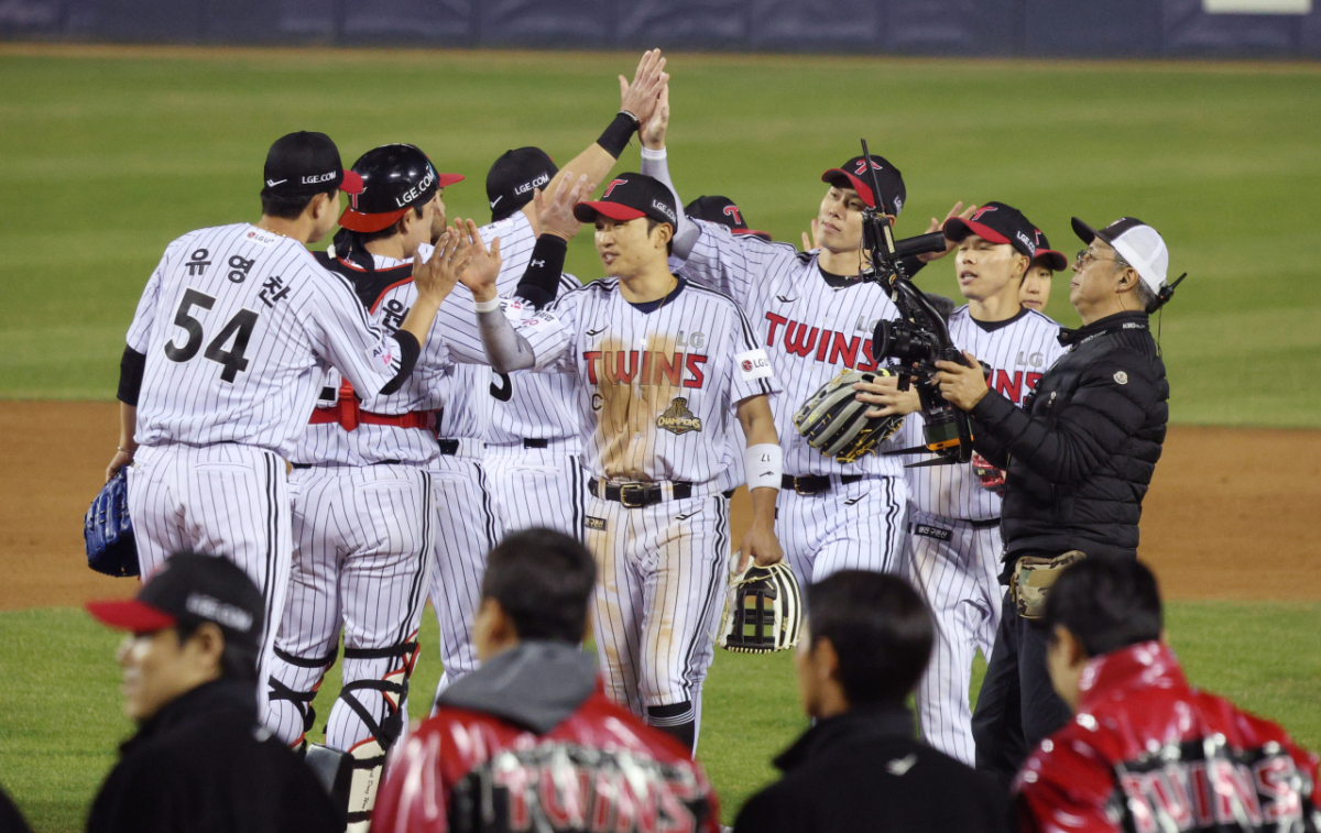 박해민을 비롯한 LG 선수들이 KIA에 2-1 승리 후 기쁨을 나누고 있다.