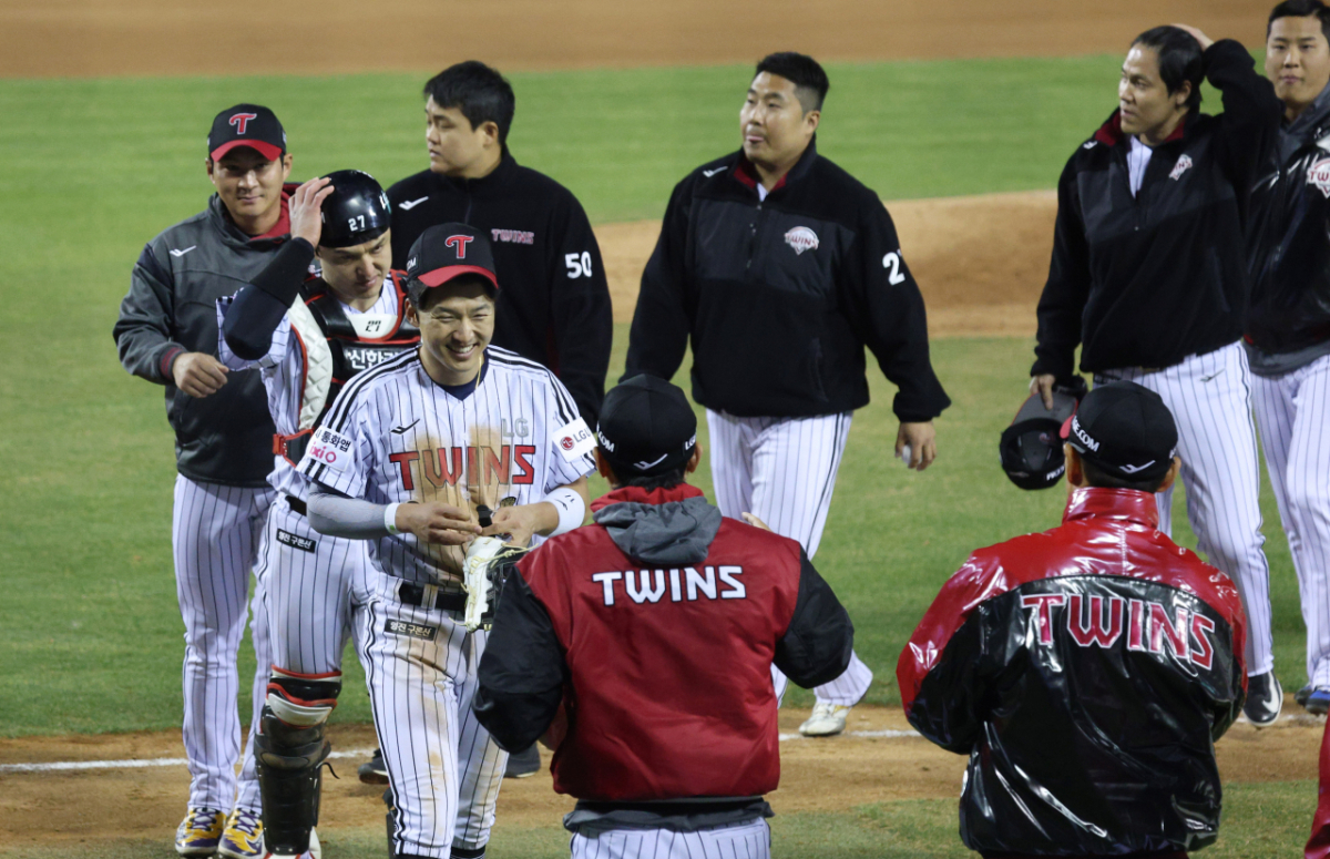 박해민을 비롯한 LG 선수들이 KIA에 2-1 승리 후 염경엽 감독과 기쁨을 나누고 있다.