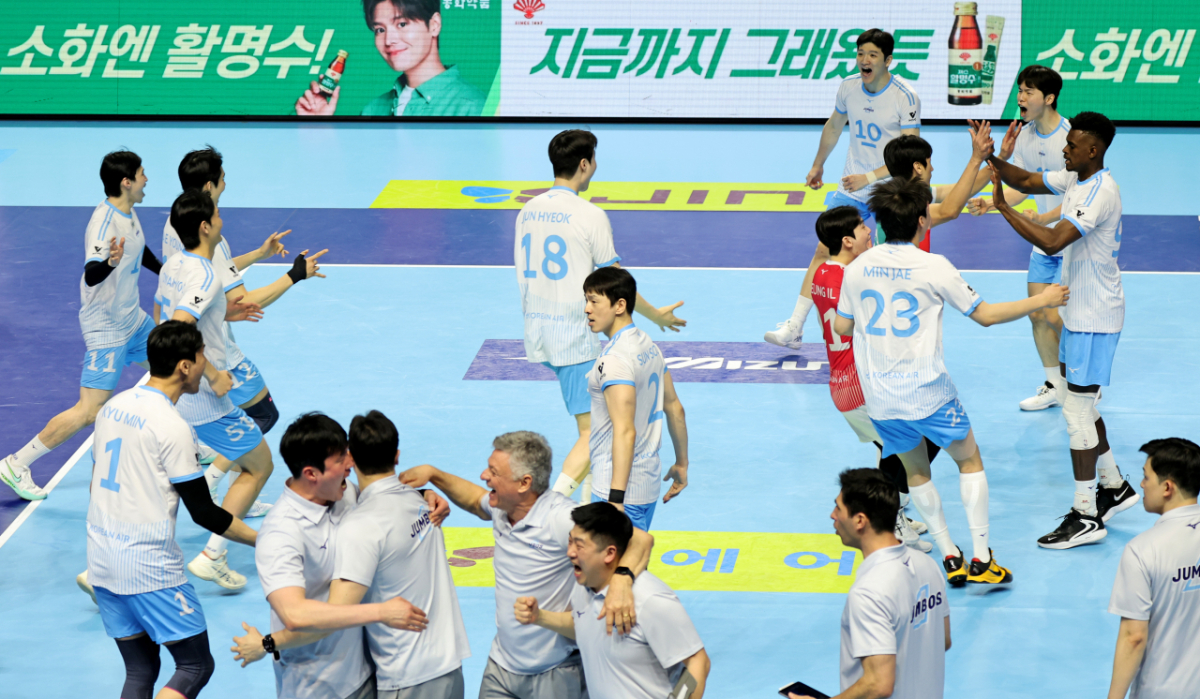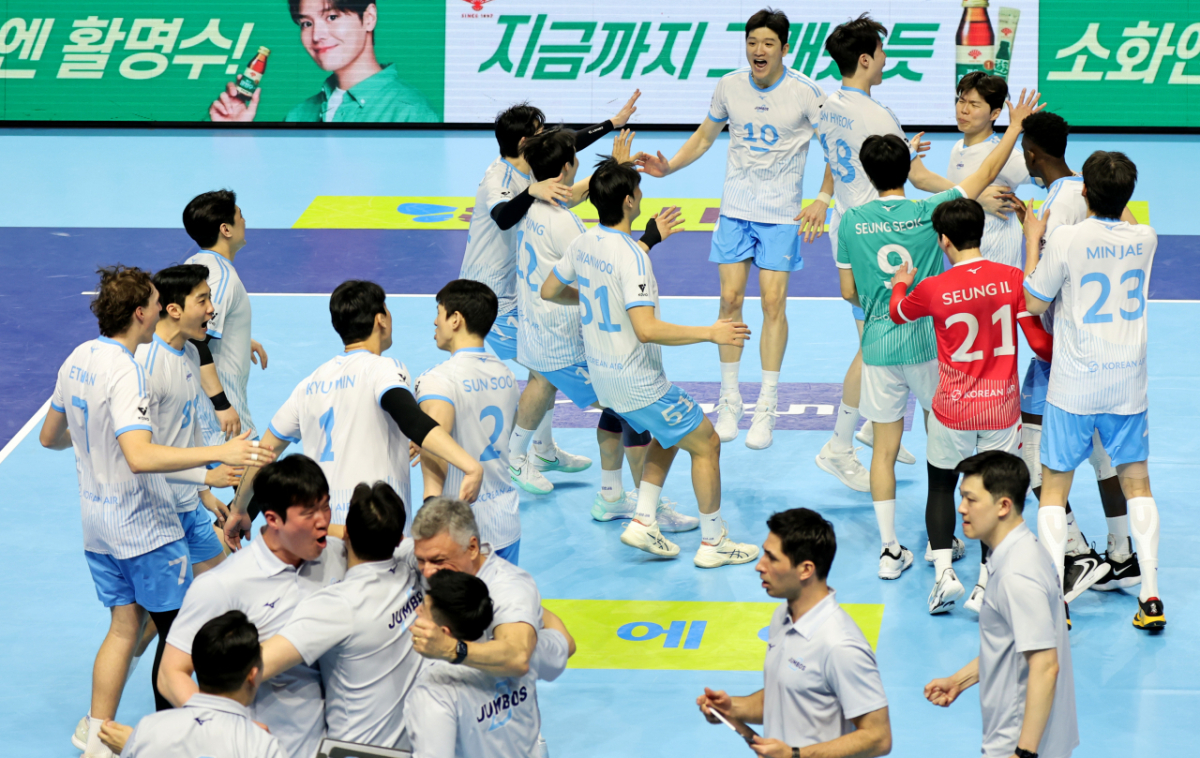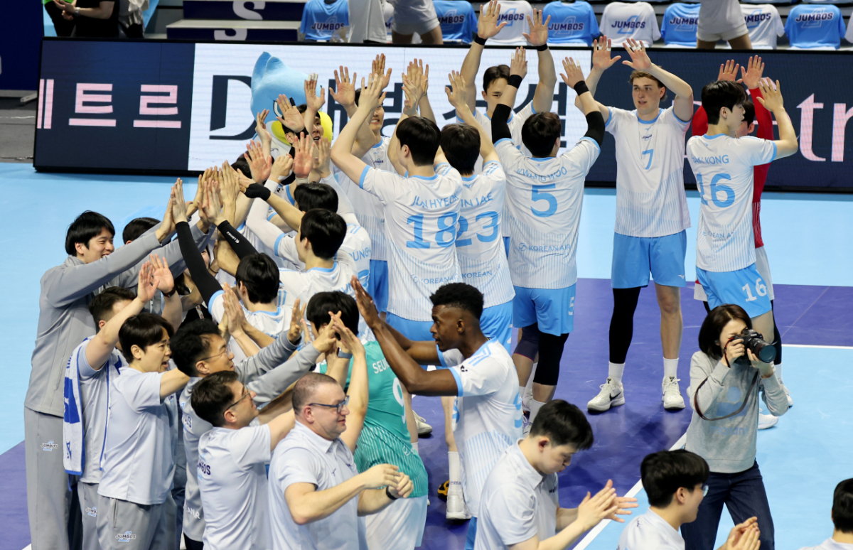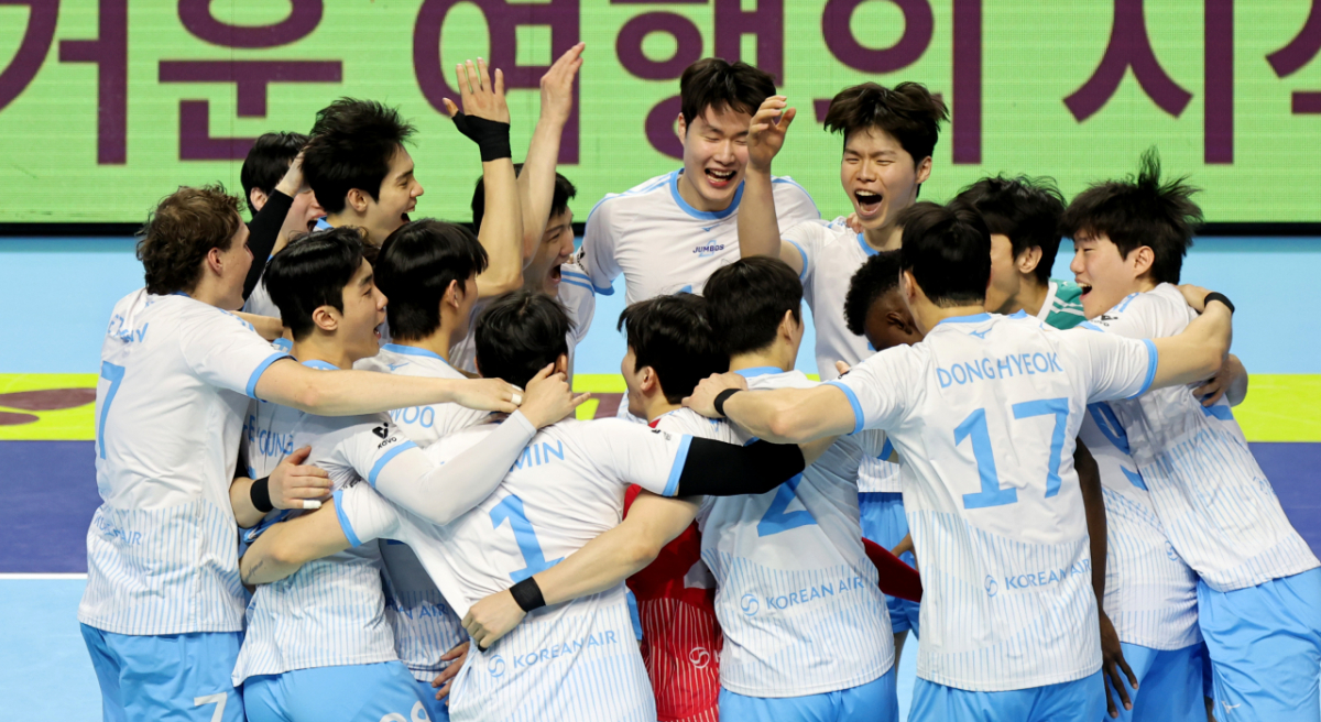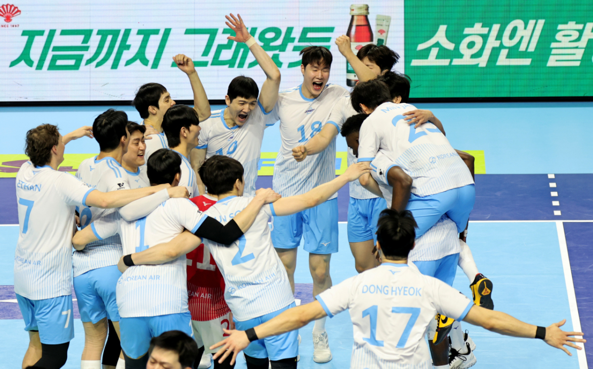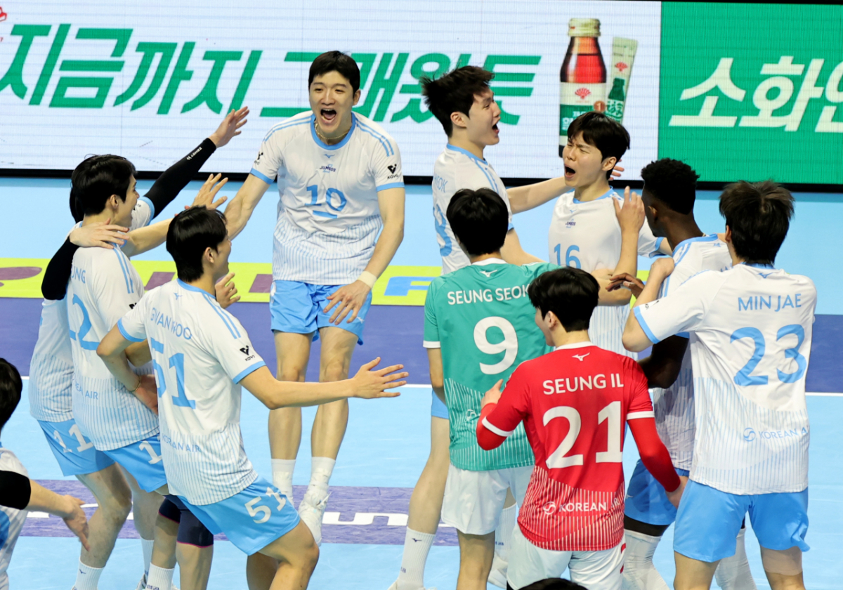 대한항공 선수들이 3일 계양체육관에서 열린 진에어 2025-2026 V리그 챔피언결정전 대한항공과 현대캐피탈 경기 5세트를 따내며 우승에 유리한 고지에 오른 후 기쁨을 만끽하고 있다. 2026.04.03.