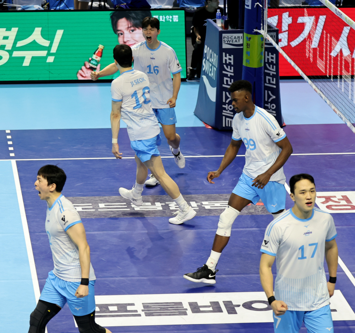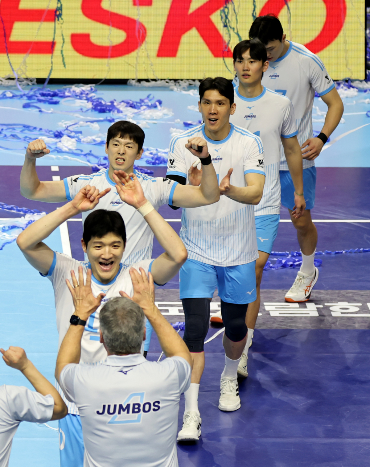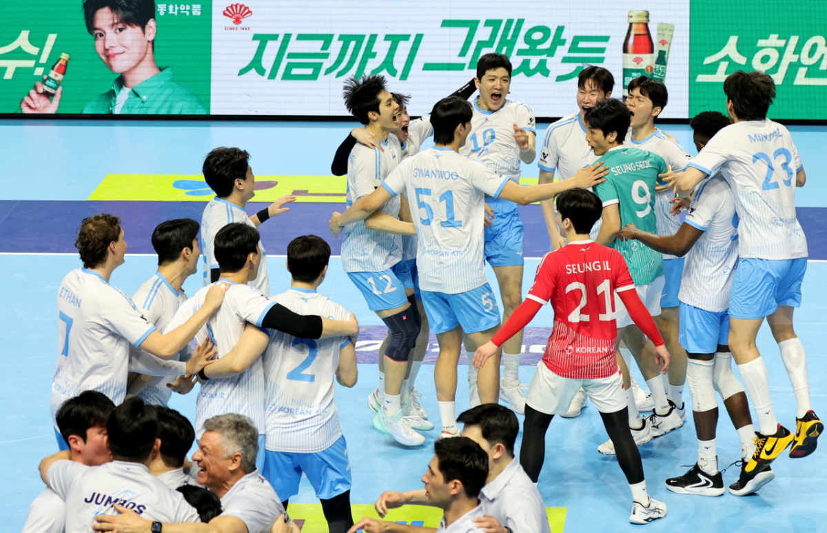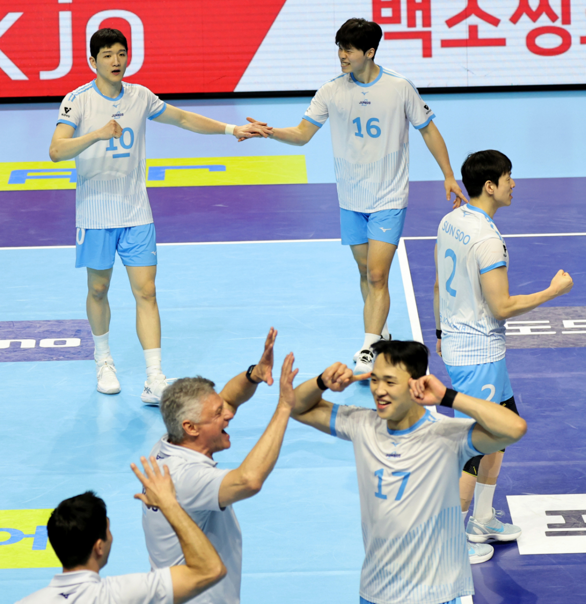 대한항공 선수들이 3일 계양체육관에서 열린 진에어 2025-2026 V리그 챔피언결정전 대한항공과 현대캐피탈 경기 5세트를 따내며 우승에 유리한 고지에 오른 후 기쁨을 만끽하고 있다. 2026.04.03.