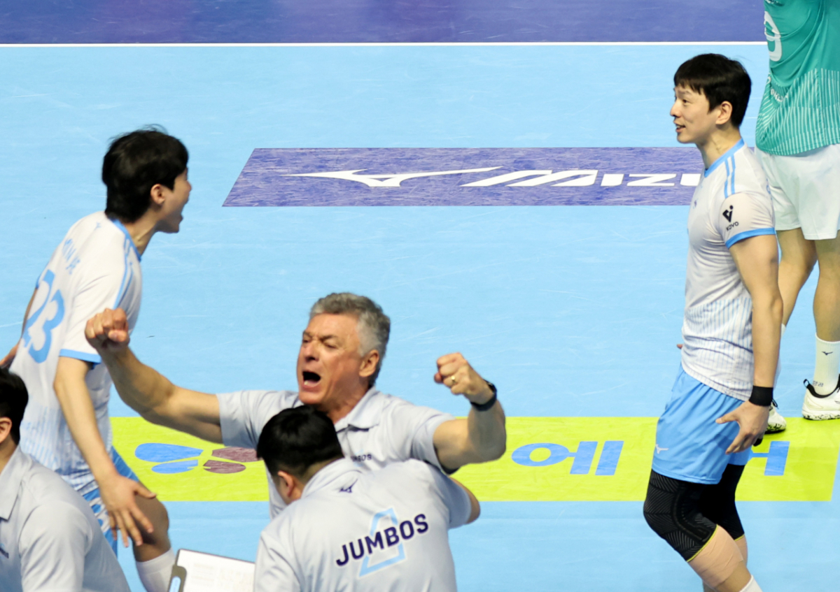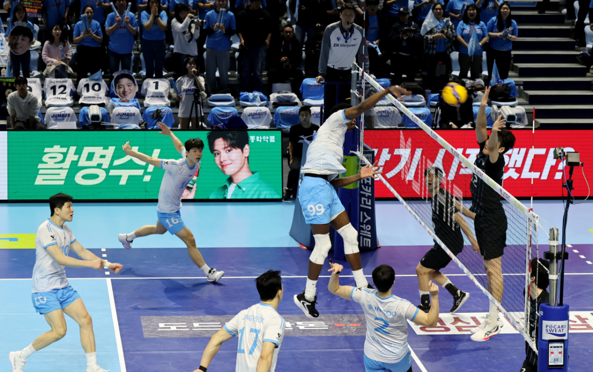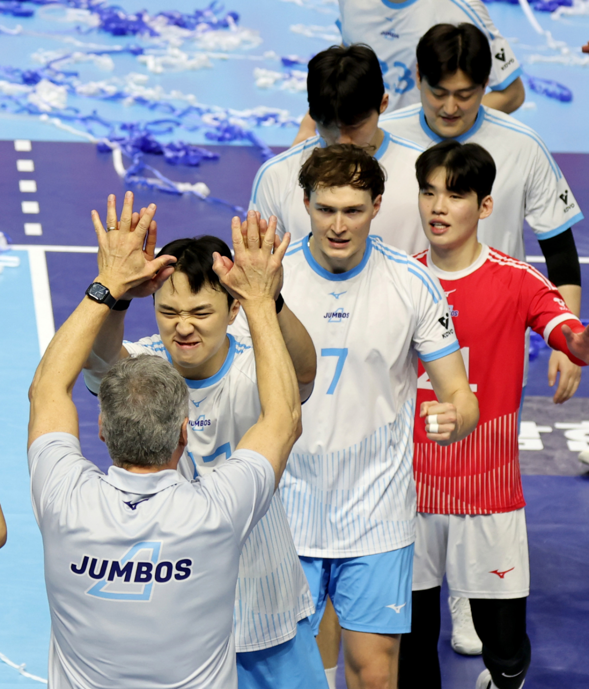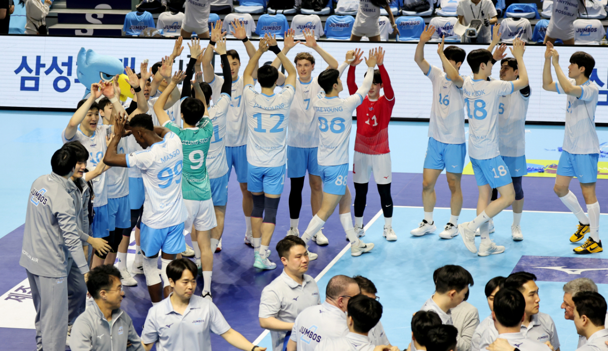 대한항공 선수들이 3일 계양체육관에서 열린 진에어 2025-2026 V리그 챔피언결정전 대한항공과 현대캐피탈 경기 5세트를 따내며 우승에 유리한 고지에 올랐다. 마지막 점수는 마쏘가 기록했고, 14점째는 임동혁이 따냈다. 조원태 KOVO총재도 축하를 위해 코트로 나섰다.