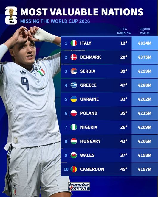 축구 통계 매체 '트랜스퍼마크트'는 2일(이하 한국시간) 소셜 미디어를 통해 "2026 월드컵 불참이 확정된 대형 스쿼드들"이라며 본선 무대를 누비지 못하는 국가 중 선수단 가치가 높은 팀 'TOP 10'을 공개했다.