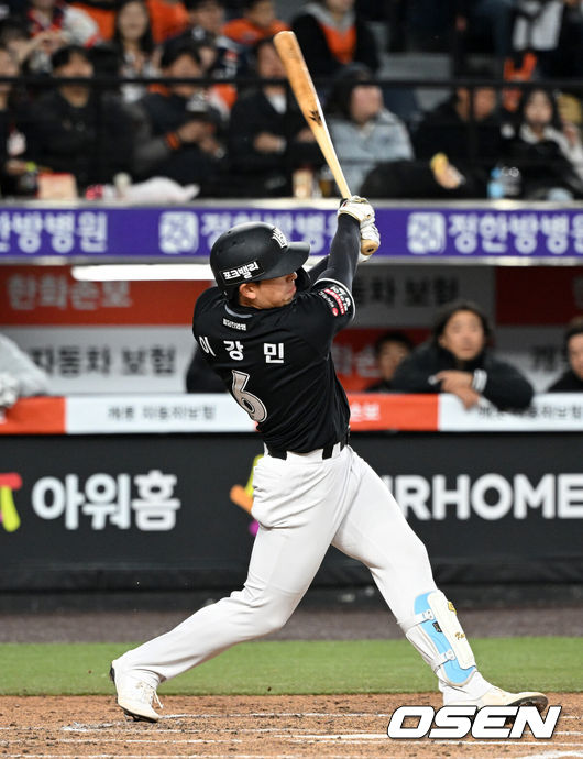 이강민은 0-0이던 3회초 선두타자로 등장해 한화 선발 문동주 상대 좌전안타를 치며 5득점 빅이닝 서막을 열었다. 후속타자 최원준의 볼넷, 김현수의 내야땅볼 때 2루를 지나 3루를 밟은 그는 안현민의 우전안타가 터지며 0의 균형을 깨는 득점을 올렸다. 이날의 결승점이었다.