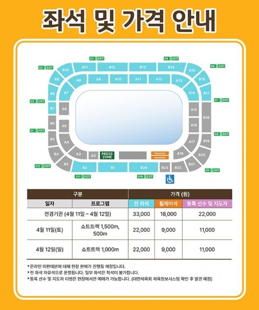 이번에 판매가 되는 것은 2차. 2차 1일차에는 1500m, 500m, 2일차에는 1000m가 진행된다. 일반적으로 쇼트트랙 국대선발전은 마지막 날에 선수들 사인을 받을 수 있기에 팬들이 몰린다. 여기에 11일에는 임종언, 12일에는 김길리 사인회가 열린다.
