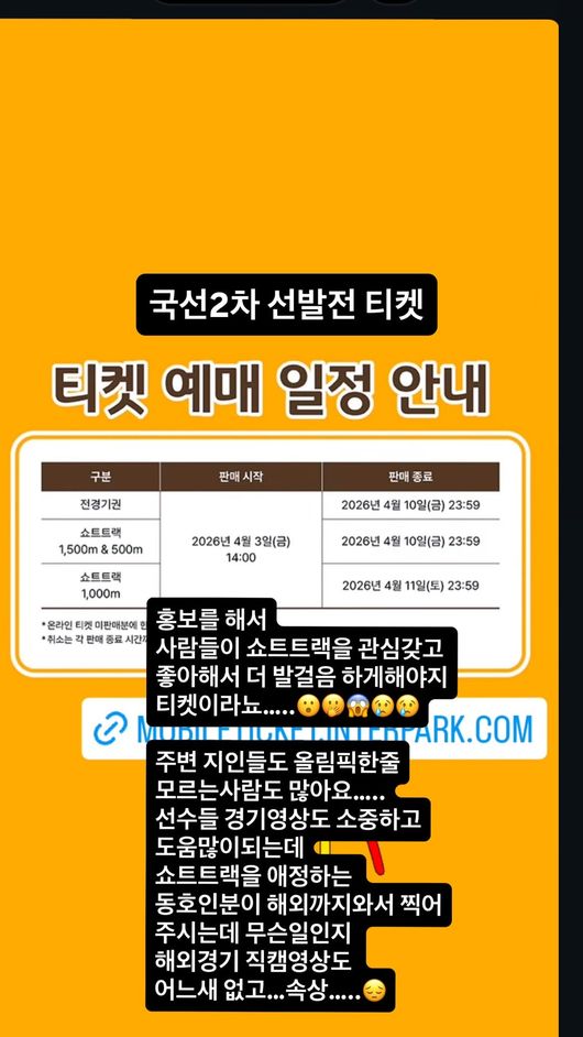 또한 그는 "선수들 경기 영상도 소중하고 도움 많이 된다. 쇼트트랙을 애정하는 동호인분이 해외까지 와서 찍어 주시는데 무슨 일인지 해외경기 직캠영상도 어느새 없고...속상하다"라고 덧붙였다.