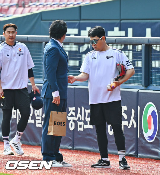 3일 오후 서울 잠실구장에서 2026 신한은행 SOL Bank KBO리그 두산 베어스와 한화 이글스의 경기가 진행됐다. 이날 두산은 플렉센을, 한화는 에르난데스를 선발투수로 내세웠다. 경기 앞서 두산 양의지와 황재균 해설위원이 이야기 나누고 있었다.