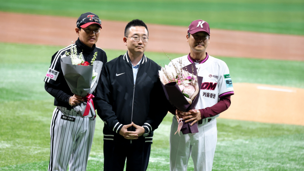 LG 염경엽 감독과 키움 설종진 감독이 4일 여척스카이돔에서 열린 2026KBO리그 키움히어로즈와 LG트윈스 경기를 앞두고 고척개막식에 참석해 허승필 키움단장으로부터 꽃다발을 받고 기념촬영을 하고 있 다. 2026.04.03.
