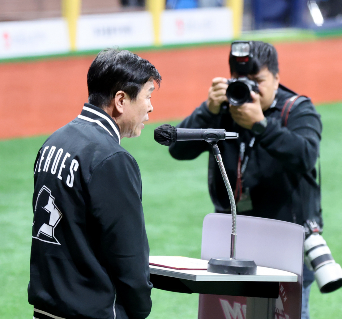 키움 위재민 대표이사가 4일 여척스카이돔에서 열린 2026KBO리그 키움히어로즈와 LG트윈스 경기를 앞두고 고척개막을 선언한 후 퇴장하고 있다. 202604.03.