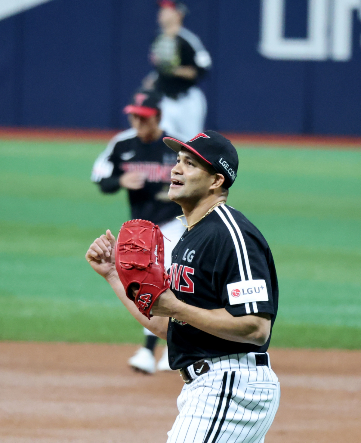 LG 우완투수 치리노스가 4일 고척스카이돔에서 열린 2026 KBO리그 키움히어로즈와 LG트윈스 경기에서 선발로 나섰다. 그는 1회말 병살로 위기를 넘겼다. 치리노스는 이날 경기에서 역투했다.