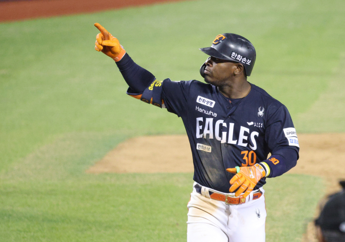한화 페라자가 4회초 1사 1루에서 두산 박신지를 상대로 우월 2점 홈런을 날리고 홈인하고 있다.