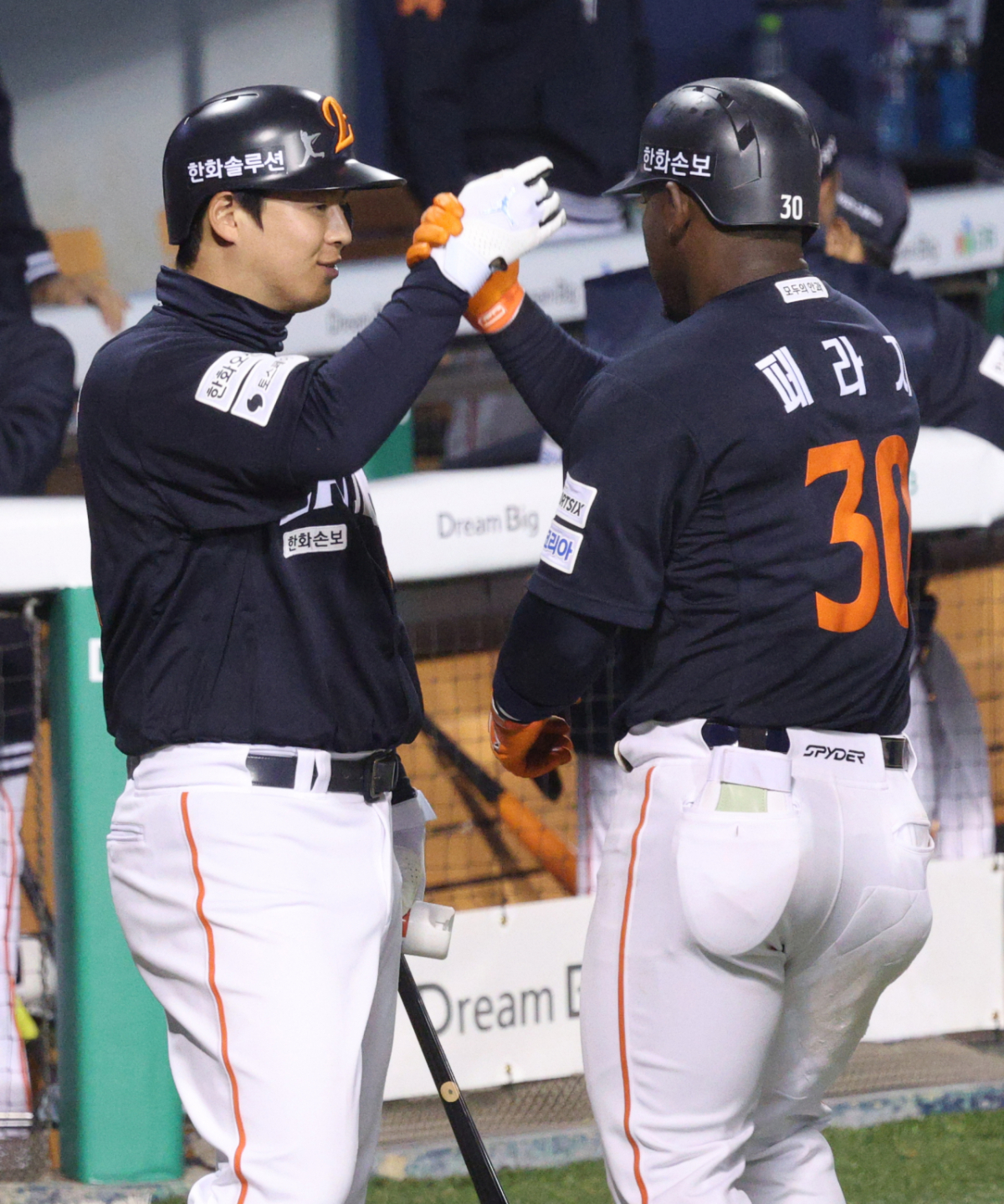 한화 페라자가 4회초 1사 1루에서 두산 박신지를 상대로 우월 2점 홈런을 날리고 홈인한 후 노시환과 기쁨을 나누고 있다.