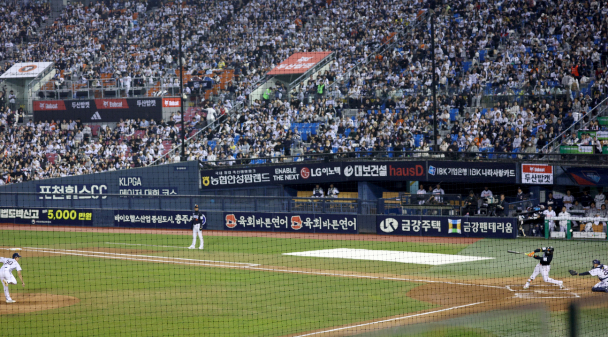 구장을 가득 메운 야구팬들이 응원을 하며 명승부를 관전하고 있다.